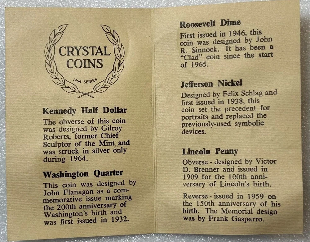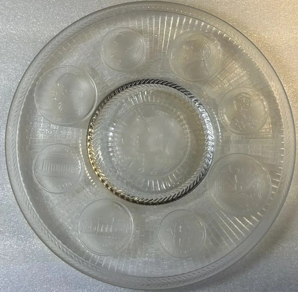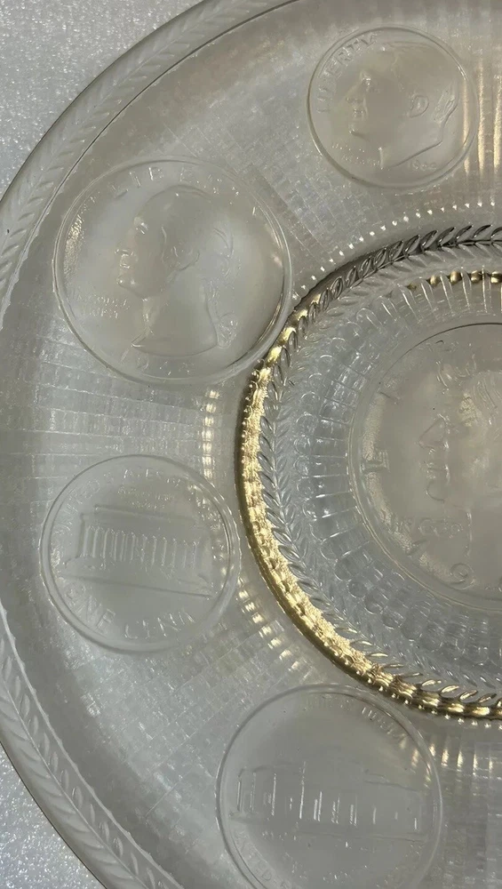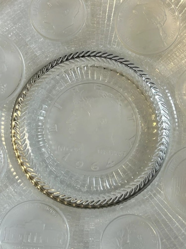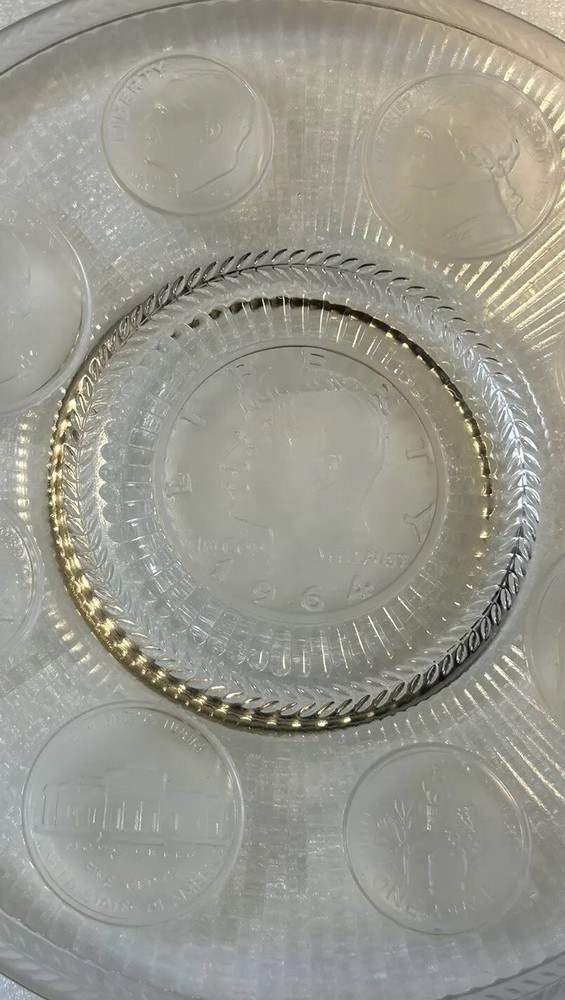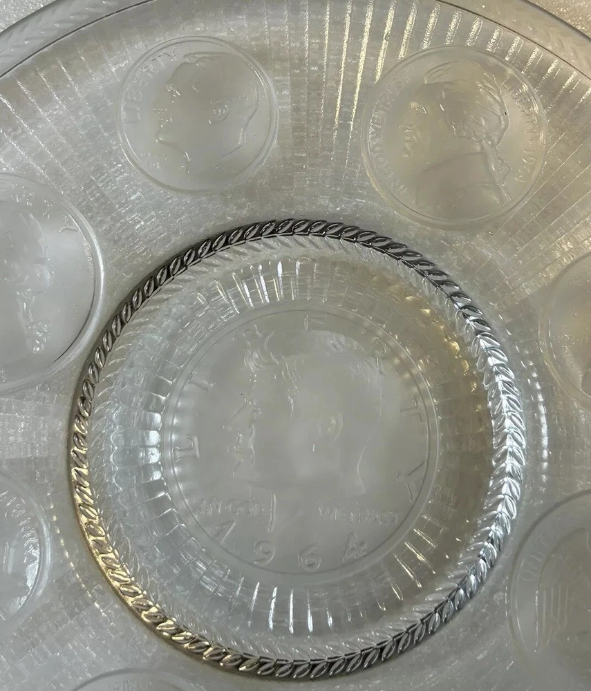1964 Crystal Coins Imperial Clear Glass Collector Plate Silver USA Vintage This beautiful handcrafted vintage crystal collector plate from Imperial Glass features a stunning design of all the US coins released in 1964, the last year that silver was used in US coinage. It is in wonderful condition, with no chips or cracks. Please see photos for details. Measurements are approximate. Smoke free home. I use recycled materials in shipping whenever possible and advisable. Please let me know if you have any questions.