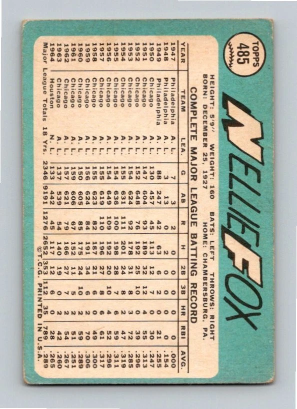 You are purchasing a 1965 Topps Nellie Fox #485. You will receive the exact item in the photographs. Thank you for looking. Listed With Mascot .