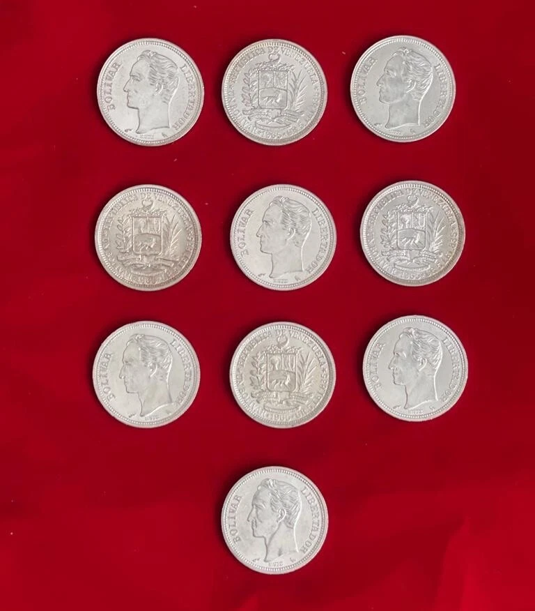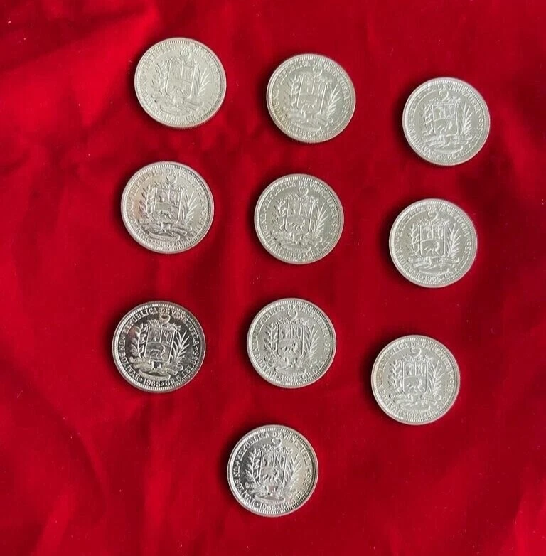 The arms of Venezuela with a legend at the top and the value, date, weight, and fineness at the bottom. Obverse Lettering: REPÚBLICA DE VENEZUELA UN BOLÍVAR - 1965 - GR.5 - LEI.835 Translation: Venezuela Republic One Bolivar 1965 5 grams 0.835 Reverse Bust left flanked with legend and the engraver's name and privy marks at the base Script: Latin Lettering: BOLÍVAR LIBERTADOR BARRE Translation: Bolivar Liberator Barre Engraver: Desire- Albert Barre Edge: Milled Venezuelan Bolivares Bs.1 Silver Coins - A collection of 10 silver coins Mint Condition Uncirculated