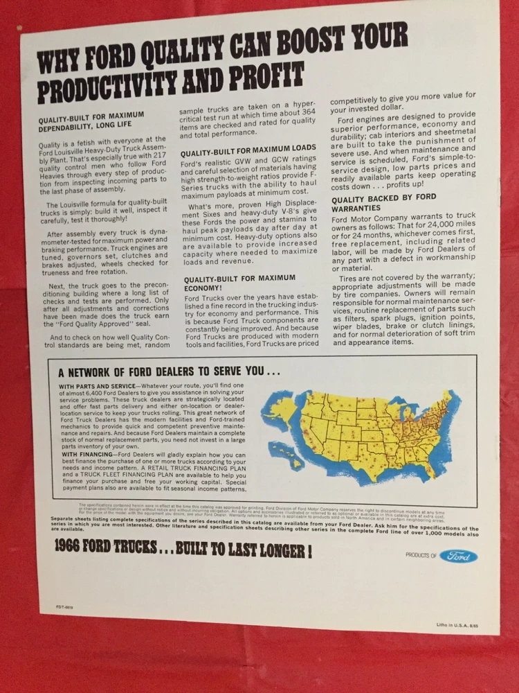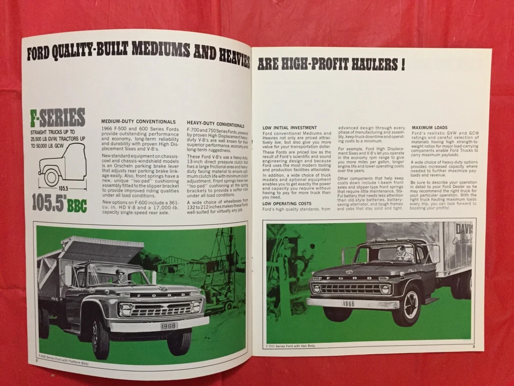 ITEM:::: This Listing is for an original 1966 FORD "F-SERIES CONVENTIONAL CAB TRUCKS" Truck Dealer Sales Brochure. ..... DIMENSIONS:::: About 11 by 8 3/8 inches and there are 8 pages with covers.. ...... CONDITION:::: The general overall condition is VG.... ... (Please refer to pictures & e-mail for details). ......... ABREVIATIONS:::: E=Excellent with no issues..... VG = Very Good with very lite issues..... G/VG = Good to Very Good with lite issues..... G + = Good+ with lite to moderate issues..... G = Good with moderate issues..... G - = Good- with moderate+ issues..... F/G = Fair to Good with quite a few issues..... F = Fair with many issues..... P = Poor with lots of issues..... Please let the pictures help you decide condition because they are an integral part of the description! Please e-mail with questions...... I will combine shipping & you will only pay $6.98 for shipping no matter how many items you accumulate! You can take up to 30 days to accumulate Items for combined shipping. Please drop me a note after your 1st win letting me know that you intend to wait to pay so that you can take advantage of combined shipping...... I will ship your Package to the address that you have registered on EBAY---Ergo, I will ship to the address that is on the shipping label when I print it from EBAY---Please do not ask me to ship to any other address---I will not do it! My goal is 100% satisfaction! I will refund 100% of your costs if you are not satisfied! Thanks for visiting!