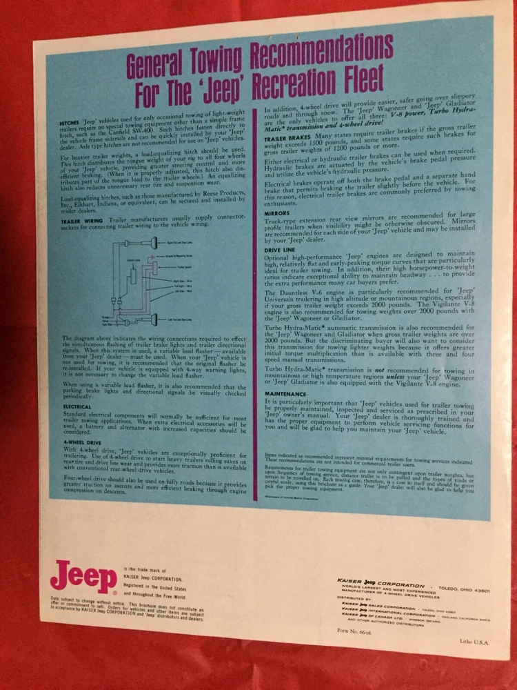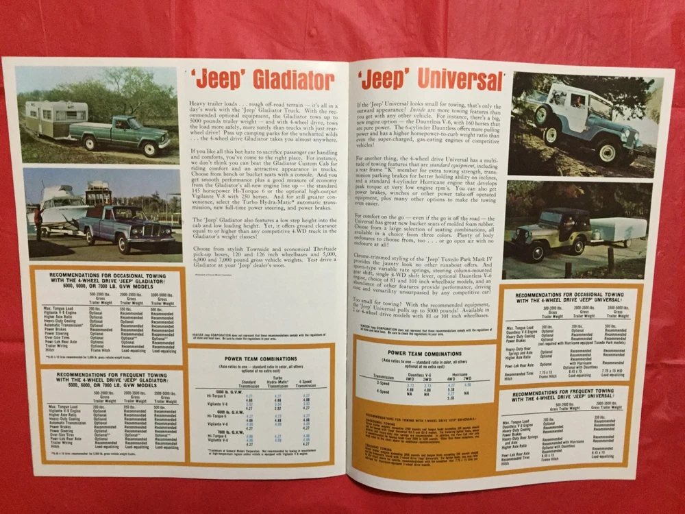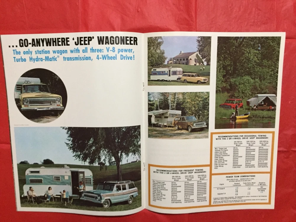 ITEM:::: This Listing is for an original 1966 JEEP "WAGONEER GLADIATOR UNIVERSAL" Truck Car Dealer Sales Brochure.. ..... DIMENSIONS:::: About 11 by 5 inches and there are 8 pages with covers ....... CONDITION:::: The Condition is generally mostly as follows:::: Inside pages are VG..... Covers are G/VG.... ... (Please refer to pictures & e-mail for details). ......... ABREVIATIONS:::: E=Excellent with no issues..... VG = Very Good with very lite issues..... G/VG = Good to Very Good with lite issues..... G + = Good+ with lite to moderate issues..... G = Good with moderate issues..... G - = Good- with moderate+ issues..... F/G = Fair to Good with quite a few issues..... F = Fair with many issues..... P = Poor with lots of issues..... Please let the pictures help you decide condition because they are an integral part of the description! Please e-mail with questions...... I will combine shipping & you will only pay $6.98 for shipping no matter how many items you accumulate! You can take up to 30 days to accumulate Items for combined shipping. Please drop me a note after your 1st win letting me know that you intend to wait to pay so that you can take advantage of combined shipping...... I will ship your Package to the address that you have registered on EBAY---Ergo, I will ship to the address that is on the shipping label when I print it from EBAY---Please do not ask me to ship to any other address---I will not do it! My goal is 100% satisfaction! I will refund 100% of your costs if you are not satisfied! Thanks for visiting!