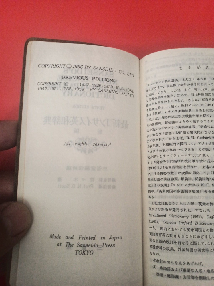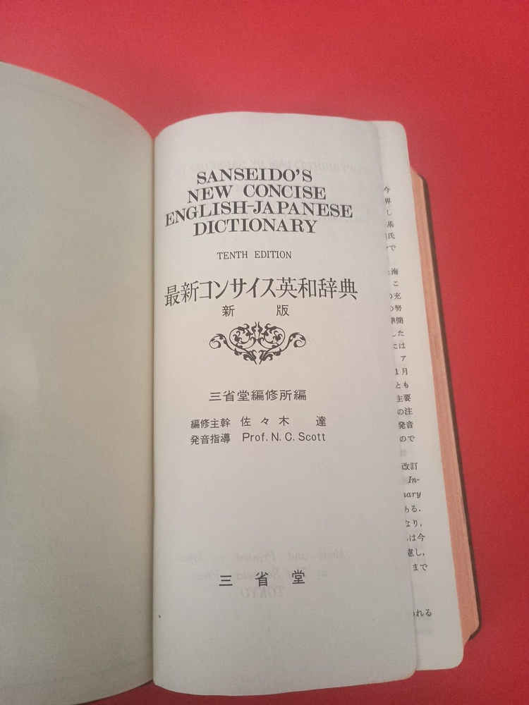 The product is a 1966 Sanseido's New Concise English Japanese Dictionary, featuring a bonded leather binding. Published by Sanseido's in Japan, this original edition is a reference book for Japanese language learners. The dictionary includes English to Japanese translations and is designed to provide concise and accurate definitions for a range of terms. This vintage dictionary would be a valuable addition to any collection of language reference materials.