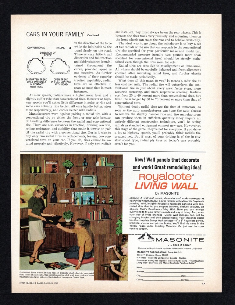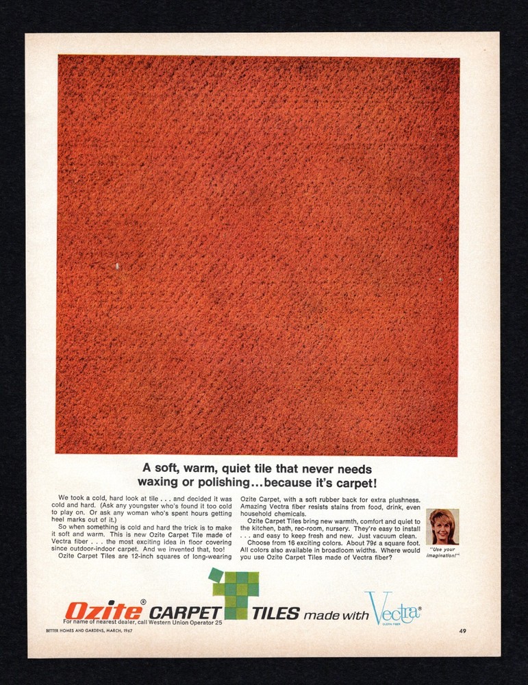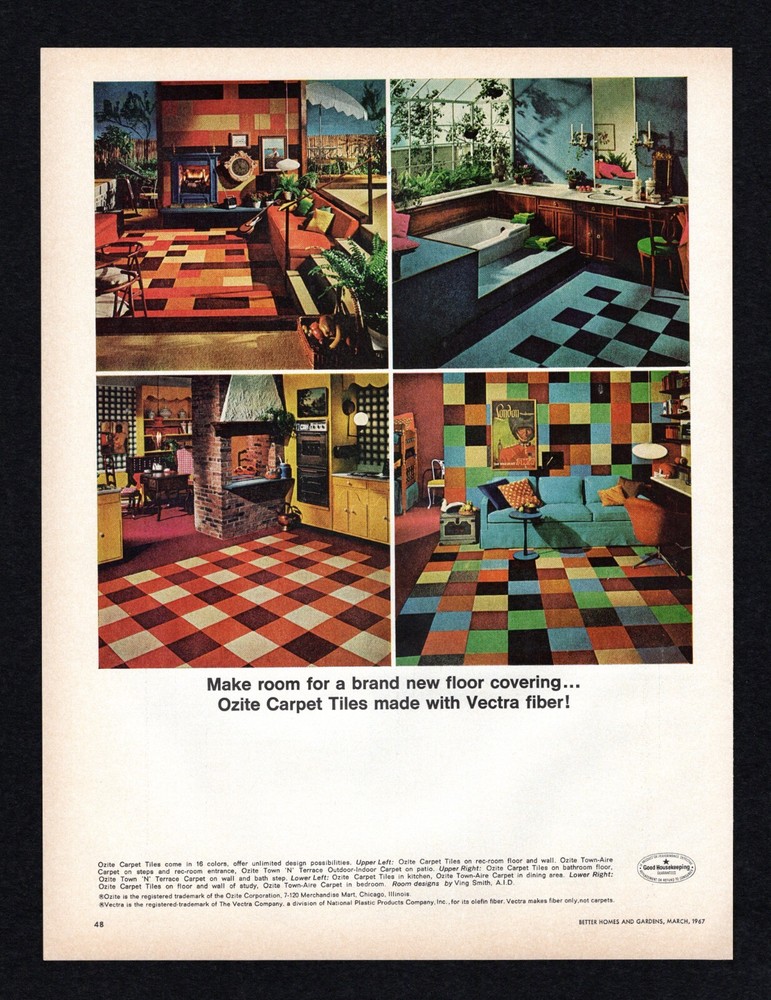 1967 Ozite Carpet Tile Vectra Fiber 2p / Royalcote Living Wall Masonite Print Ad Original Advertisement Page Placement: Interior Multiple Pages, with both sides of each page scanned and described . Suitable for Framing Ad Description/Company Name : (Ads listed in page print order) Page 1: Side 1 : ½ Page, Color Royalcote Living Wall by Masonite New! Wall panels that decorate AND work! Royalcote hardboard paneling with concealed slots that let you support brackets, shelves, pictures, art objects. Side 2 : Full Page, Color (This is the first page of Ozite 2-page ad) Ozite Carpet Tiles made with Vectra Fiber Make room for a brand new floor covering… Ozite Carpet Tiles come ni 16 colors Ozite Corporation Vectra (Only for it’s Olefin fiber. Vectra makes fiber only, not carpets.) Page 2: Side 1 : Full Page, Color (This is the second page of Ozite 2-page ad) Ozite Carpet Tiles made with Vectra A soft, warm, quiet tile that never needs waxing or polishing… because it’s carpet! “ Use your imagination!” Side 2 : No Ads on Page 2:Side 2. Note : Publication Date: March 1967 Publication Name: Better Homes and Gardens Magazine Size: Approx 9.5” x 12.5” (May be slightly smaller after pages are trimmed from magazine) Condition: Used. These are very old magazines; f oxing, fading, and discoloration may be present with older paper items. Minor corner damage and slight ripples may be present. These are original pages taken from their original magazines. Images are scanned on a Black background. The images you see are the Exact same page being sold . I take detailed scans of each one, please examine and make your own judgment. I’ll also include notes of anything out of the ordinary. Your satisfaction guaranteed! Specific Condition Notes: This entire particular issue – March, 1967, was bent diagonally on the upper inside corner before it was ever disassembled. It’s very hard to see in the scans, but is present on nearly every page , including this page . A dditionally, th is page is lightly rippled. The large square red/orange carpet tile image has a small white spot, very visible in image. Looks like a scrape. The price is reduced to reflect the condition. Ideal for: Collectors Historians Gifts Themed decoration for home or business Museums Magazine ads are shipped in: 2-mil Clear Polypropylene Magazine Bags with a white backer board, in a Rigid Mailer, in a sealed Poly Mailer, marked "Handle With Care, Do not Bend" and shipped USPS. We DO combine shipping for multiple purchases!