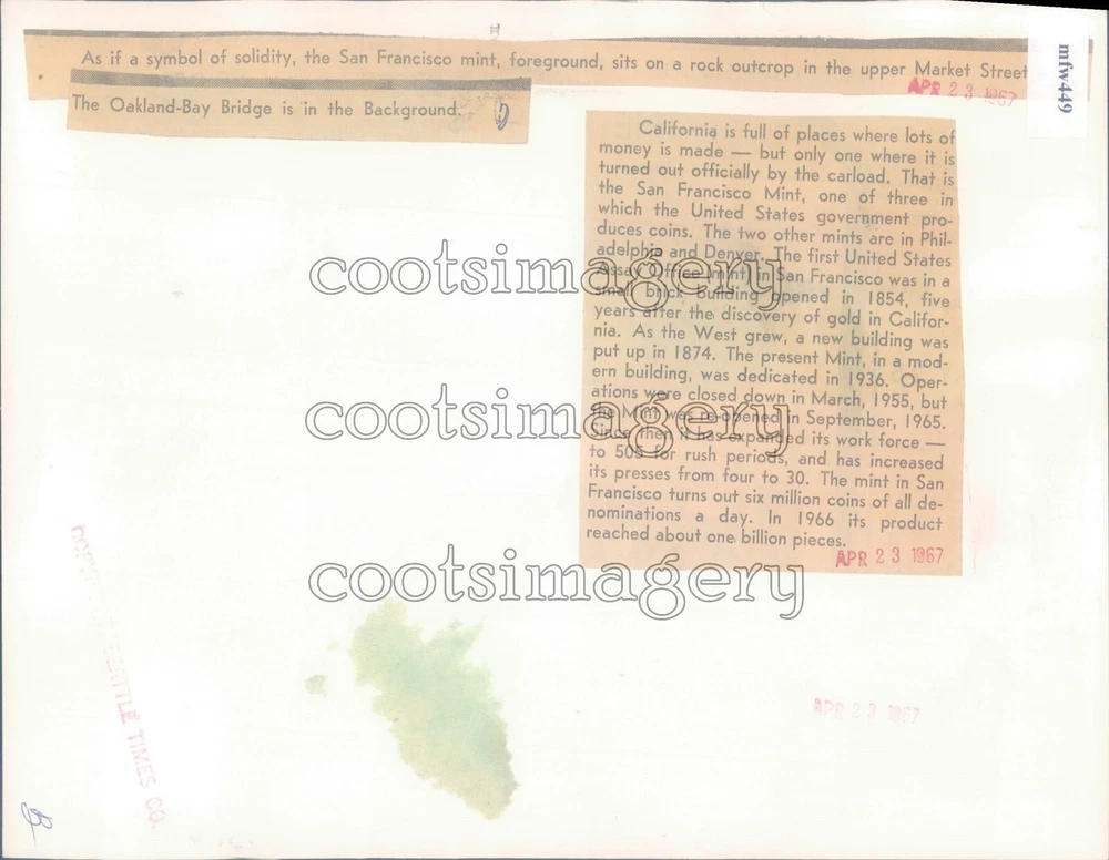 1967 Press Photo US Mint Building Oakland Bay Bridge 1960s San Francisco You are bidding on an original press photo of US Mint Building Oakland Bay Bridge 1960s San Francisco. Photo has waving left edge due to too much glue being used to attach the information sheet onto the back of the photo. Photo measures 7 x 9 inches and is dated 4/23/1967. Did you know we have two stores on eBay? You may be interested in our other photos in cootsimagery-deluxe or in our cootsimagery store. About our Photographs and Listings We have acquired one of the largest collections of Original AP, UPI and various other news service photos from several news media outlets. Most of our photographs are in great condition considering they are 20 - 90 years old. Subjects are practically unlimited so if you are interested in something particular please let me know and I will try to get an appropriate listing going for you. We handle our photographs with care once they get to us, but due to their age, the photographs may have some cracks, tears, and wrinkles that they received before they arrived in our care. Please look carefully at the pictures as they will give you the best indication of the condition of the photograph. We sell only original vintage photographs acquired from news outlets across the country. You can be assured that what you are purchasing is an original item from a news archive and has not been reproduced by us. Most items will have a date stamp on the back to indicate exactly when they were first used in the newspaper. When the photographs are scanned, the online pictures are given a "cootsimagery" digital watermark. It is only on the picture online and is not on the photograph itself. Our listing titles are based solely on information from press sources provided on the backs of the photos and occasionally some basic research which is not always 100% accurate, but this is all of the information that we have to go on, since we are not professional historians. We apologize for any inaccuracies or mistakes. As a general rule, auction items that receive no bids are relisted as Fixed-Price items at a higher price than the starting auction bid price. We add new inventory every week, so check back often! Shipping and Handling When a photograph is purchased from us, each order is packed with care between two cross-corrugated sheets of cardboard and wrapped in a plastic sleeve to ensure the packages are as difficult to bend as possible and offer some moisture protection. Shipping is charged per order and may not be combined with other seller IDs, per eBay's policy. We encourage customers interested in multiple auctions to bid and check out after all of your auctions have ended so that all items will be in the same order and subject to only one shipping charge. eBay should automatically combine shipping when you choose the Add to Cart option. Whether you buy one or 100 photos from this seller ID, the shipping charge will be the same, one flat fee for domestic or international shipments. Check the Shipping and payments tab for current rates. We ship orders Monday through Friday. We do not ship on weekends or holidays. Our standard processing time is one business day from time of cleared payment. Customs charges, import taxes, duties, etc. are the sole responsibility of the buyer. You may contact your local customs office to help you determine what these fees may be. We will not mark our shipments as anything other than merchandise. Payment Information We accept Paypal and all major credit cards through eBay's payment system. Please check the Shipping and payments tab for a complete list. Please make sure to close your tab with us within 30 days of the end date of your earliest purchased item, to ensure a smooth transaction. We leave positive feedback after receiving cleared payment, and we always welcome your positive feedback. Powered by SixBit's eCommerce Solution