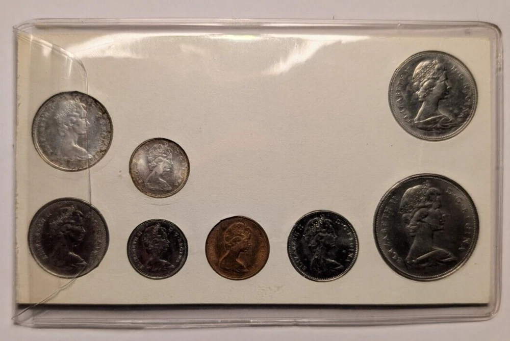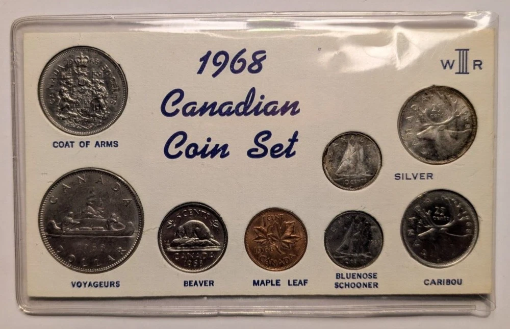 Year:1968Fineness:0.5Seller Notes:“Eight Canadian coin set from 1968 in original slip cover - Mild toning on 2 silver coins.”Certification:UncertifiedColor:Mild ToningCountry/Region of Manufacture:CanadaDenomination:VariousGrade:UngradedComposition:Copper, Nickel, Silver, ZincCirculated/Uncirculated:Uncirculated