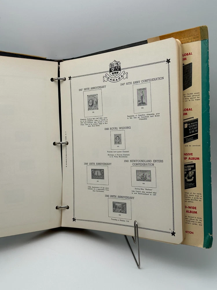 Discover the beauty of Canadian philately with this 1969 Minkus Canada Stamp Album, a comprehensive collector’s item for Canadian and provincial postage stamps. Profusely illustrated, this album is perfect for stamp collectors seeking a vintage piece to showcase their collection of Canadian stamps, including historical anniversaries and events. The binder format offers space to organize and display stamps with ease, while the classic cover design adds a touch of nostalgia to any collection. Perfect for history buffs and philatelists alike!