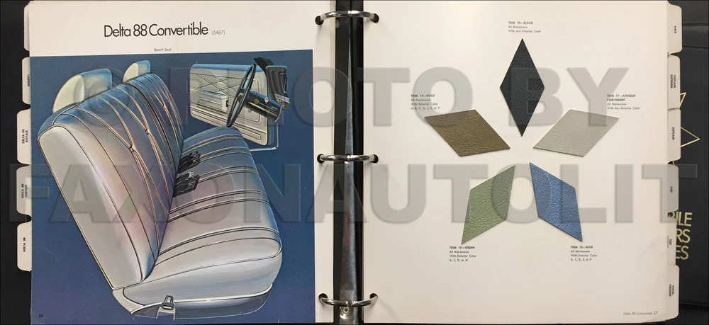 Item Description This is a dealer-only album that salespeople used. You can use this book to restore your vehicle to its historic best, upgrade with factory options, or to authenticate equipment already installed. You will find the following information in this book: Color and upholstery -- examples of the paint and upholstery. Each dealership usually had only one or two copies of this valuable book, so these albums are much rarer than most other types of literature. However, they are often the only source for hard-to-find upholstery swatches - these are actual swatches. Includes actual exterior full-page paint chips, as well as detailed lists of interior/exterior color combinations. We've had several of these over the years, and the last few paint chips always seem to be stuck together. You'll also see samples of convertible top fabrics and vinyl roof coverings. You'll get a drawing of each type of interior. Buy now to be one of the few collectors to own this privileged information. Item Specifications Exact Title: "1969 Oldsmobile Colors & Fabrics" Page Count: 50 Dimensions: 12.60 x 11.50 x 2.75 OEM Part Number: none Pay Media Mail shipping on 1 item, get FREE US shipping on 2nd item if shipped together. Find more in our store Click here for more 1969 Oldsmobile manuals. Model-Year Application Covers all 1969 Olds models. 1969 Oldsmobile 98 1969 Oldsmobile Cutlass Supreme 1969 Oldsmobile Delta 88 Custom 1969 Oldsmobile F85 1969 Oldsmobile Toronado Custom 1969 Oldsmobile 442 1969 Oldsmobile Cutlass 1969 Oldsmobile Delta 88 1969 Oldsmobile Delta 88 Royale 1969 Oldsmobile Toronado 1969 Oldsmobile Vista Cruiser Shipping Policies Shipping U.S. Super saver postal media mail with delivery confirmation is the lowest-priced option. Media mail typically takes 7-14 business days to arrive in the continental US.. To AK, HI, PR, and APO, media mail takes a month so we recommend priority mail instead. Optionally, get this item sent to the US via postal Priority Mail with delivery confirmation for an additional cost (see shipments tab). Please request a quote for combined Priority Mail shipping, since multiple items may require extra shipping costs. Shipping Overseas Economy shipping does NOT include tracking. Standard shipping usually includes tracking. International shipments typically take 1-3 weeks for delivery, but can take longer. Please supply a phone number with your order to ensure timely delivery of your package. Shipping Canada Shipment to Canada includes tracking. We pay GST. Books and CDs are duty free, so you should owe nothing when your package arrives. Shipment to Canada typically takes 2 weeks for delivery. Hours Open 7:30 am to 4:30 pm pacific time weekdays, 8:30 am to 1:30 pm Saturdays. Closed Sundays and holidays. Finally, Buy With No Risk from the Auto Literature Experts Pledge of Honesty We are a high tech company with old-fashioned integrity. Our Promise of Value: When you buy from Faxon, you know that the book you get will cover the years and content listed in the long description. We got to be the largest sellers of out of print auto books by becoming the experts on what you need to get your project on the road. Our Assurance of Security: We have never sold or shared a phone number, email address, or street address. We have never had a credit card number stolen. Your personal information is safe with us. Backed by More than Forty Years of Professional Experience: For more than forty years, we have been researching auto literature. We have built a library of rare manuals and compiled lists of manuals that exist. No other company has invested so much time and effort to find the best book for your vehicle. We buy from every major printer in the US in order to offer you the finest quality books and the best selection anywhere. Powered by SixBit's eCommerce Solution