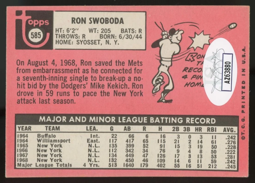1969 Topps Ron Swoboda #585 Signed Auto JSA