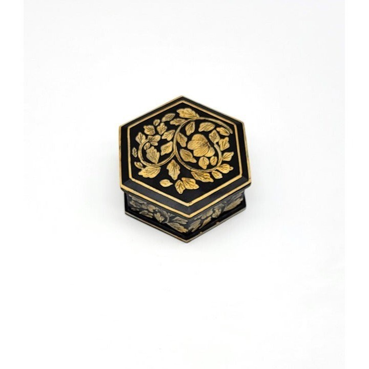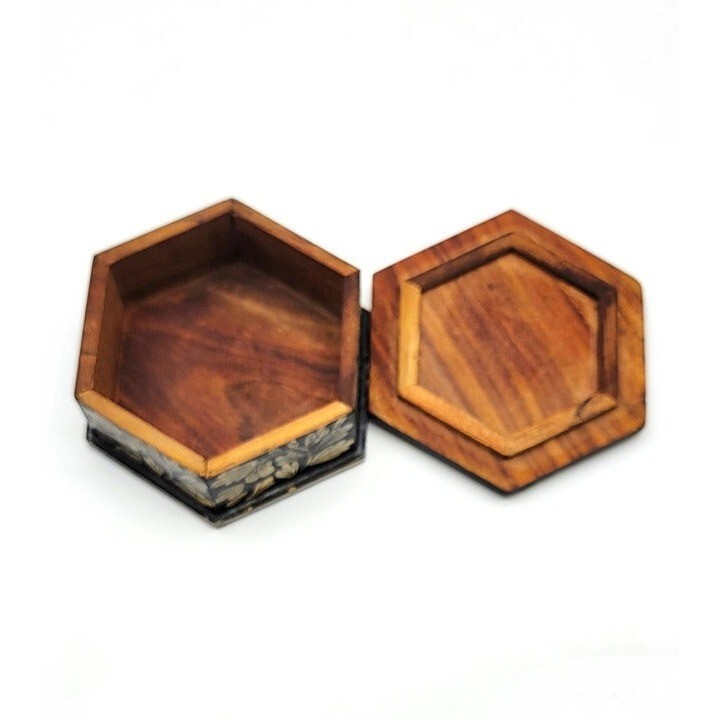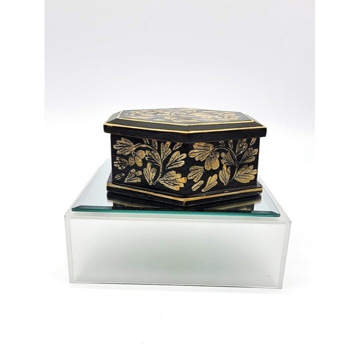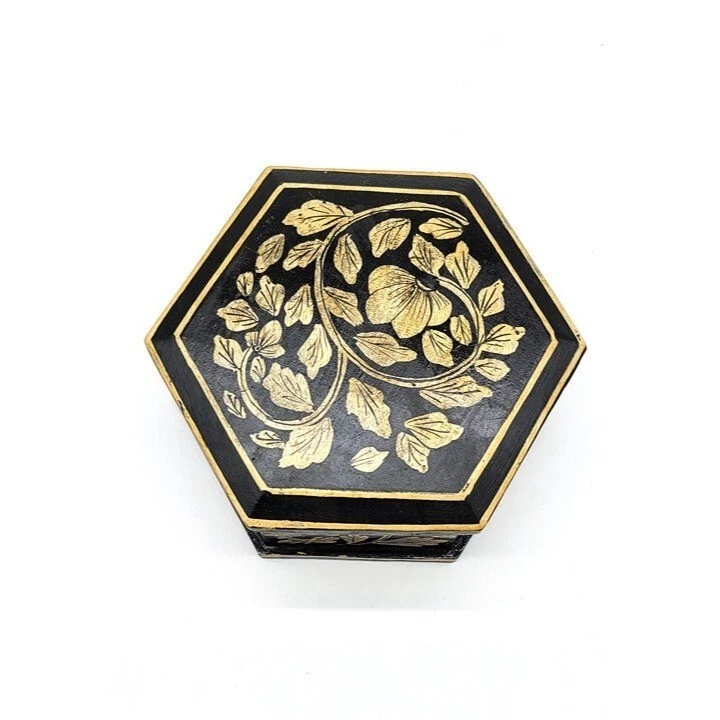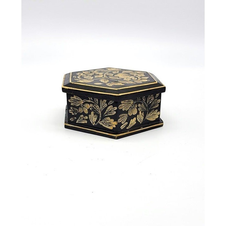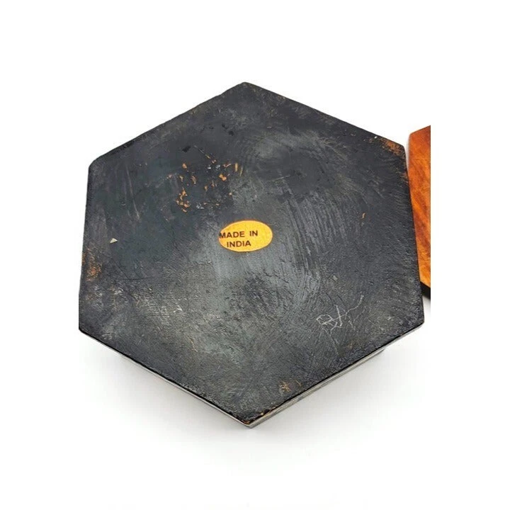 BRAND: 1790s Handmade and Hand Painted Hexagonal Wood Bos, Made in India SIZE: Approximately 5" across and 2.25" Tall. MATERIAL: Wood and Paint COLORWAY: Black and Cream Colored Accents. Brown interior of box. CARE: Hand wipe with soft cloth. CONDITION: This is a vintage wooden hexagonal hand painted box made in India 1970s. It is in very good shape and I see no cracks or signs of damage. The box is perfect for keepsakes or jewelry and would be beautiful in most decors. You can see from my photos that the bottom has some wear of the black paint which can easily touched up. Thank you for shopping with us and have a wonderful day!