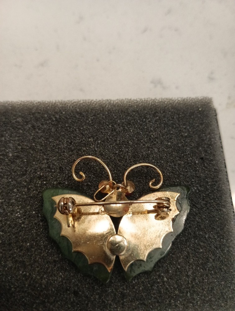 This 1970s Vintage Green Jade Butterfly Brooch Pendant features intricately carved coral eyes, making it a unique and eye-catching accessory. The natural green jade stone in the shape of a butterfly adds a touch of elegance and charm, perfect for occasions like Mother's Day or birthdays. This vintage piece from China is a beautiful representation of animals and insects theme, making it a special addition to any jewelry collection.