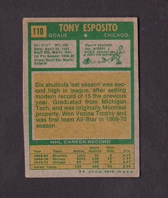 1971 Topps # 110 Tony Esposito in fair condition with wax stains and creases. SHIPPING IS FREE. Please check out the many 1960's to 1980's Hockey cards I have listed in my e-bay store. If you think you might buy multiple items from any seller that offers combined shipping, use the "Add To Cart" option under the "Buy It Now" button instead of the buy-it-now, and this will combine your purchases into one shipping charge as you add more items to your cart and purchase. Only make your payment after you have added all the items you want into your cart - you should then see that there is one charge for shipping when you go to make your payment. (REA, 05-11, #1564)