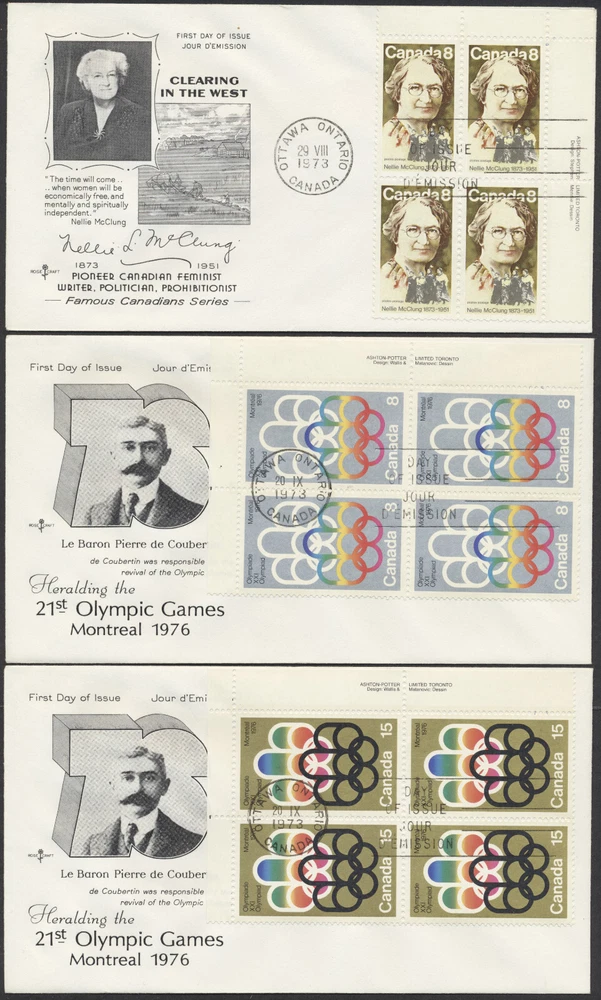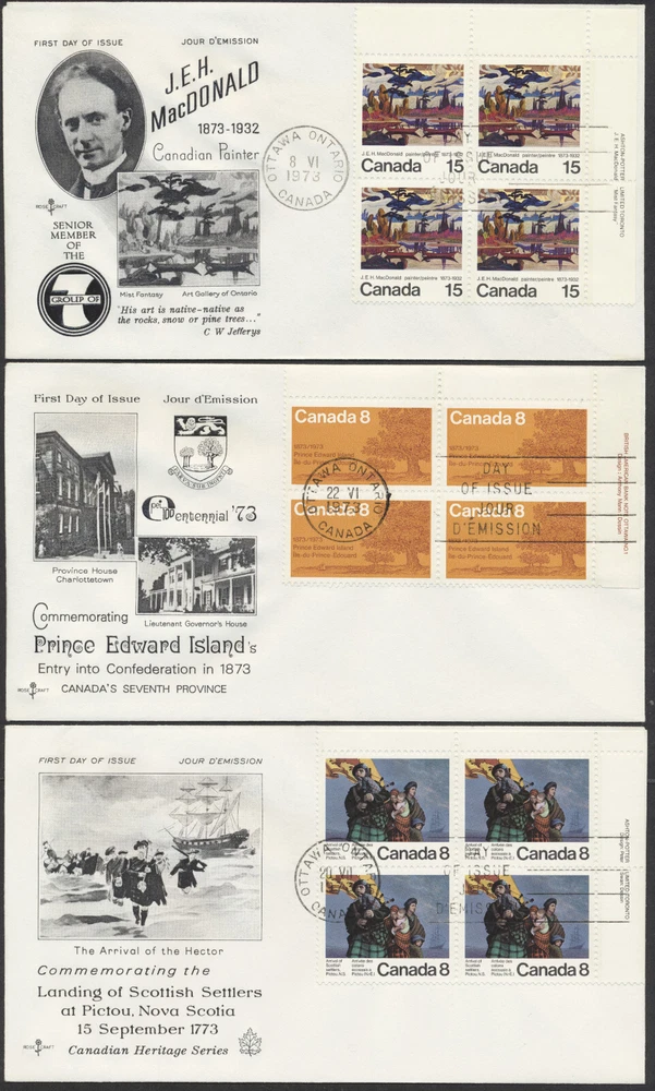 #611, 615-619, 622-624. 9 FDCs from 1973, UR plate blocks, Rosecraft cachets. Condition Note: Please examine scans. Please view the Shipping and Payments tab to see the shipping cost to your location. I always combine shipping fees. Shipments are carefully and securely packed. Sales Tax Payable by Canadian Residents Please view the Shipping and Payments tab to see the tax rate charged for each province. CRA BN 80084 7816