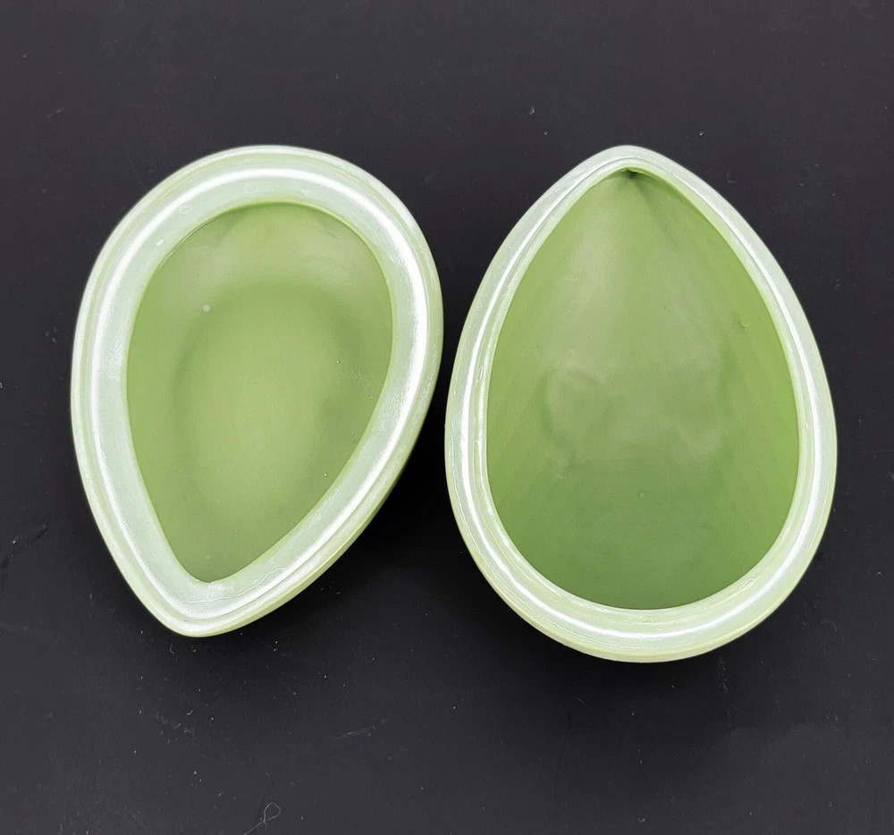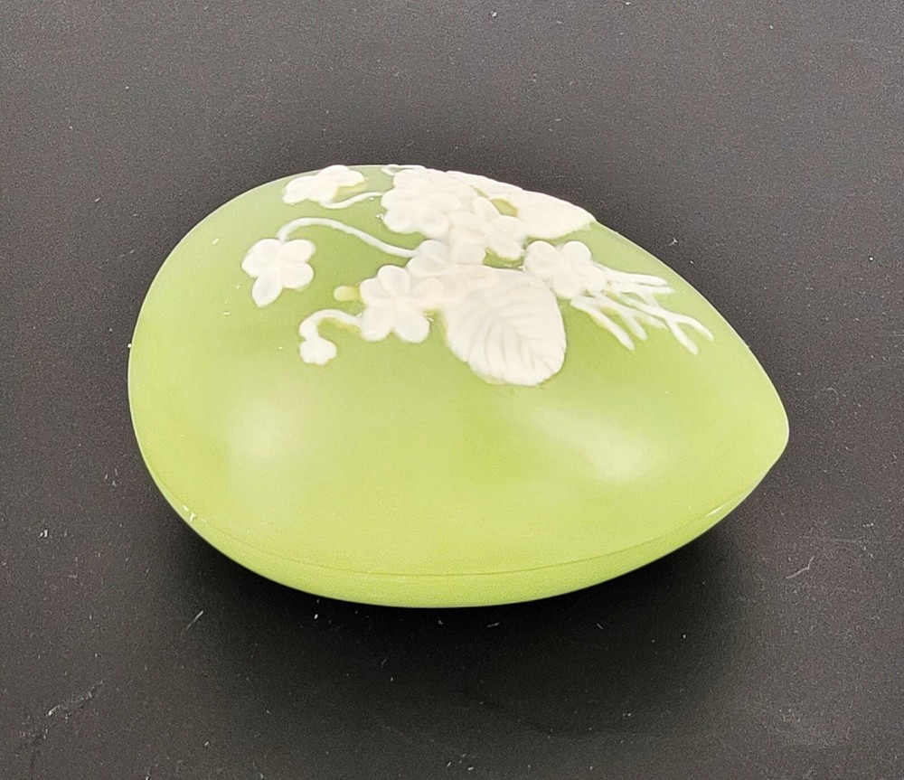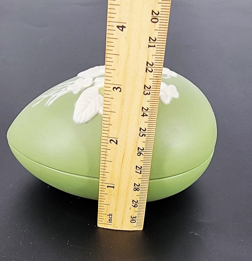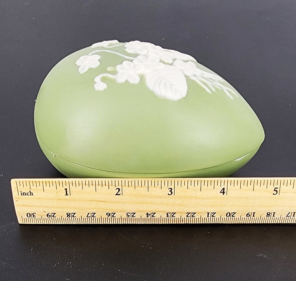 BRAND: 1975 Bell Porcelain Handmade Two Piece Egg/Easter with Raised White Violet Bouquet. Satin Finish, excellent condition! COLORWAY: White, Sage Green. SIZE: Approximately 5" Long, 3" Wide and 3" Tall. CONDITION: Beautiful Sage Green satin finished ceramic egg by Chatham Pottery 1975. It is just lovely with raised white violet bouquet, very romantic. There are no signs of chips, cracks, or damage on this charming trinket dish. It would also make a perfect Easter gift filled with surprises. The finish is very smooth and satiny to the touch. Please see my photos for exact detail. Thank you so much for visiting my store today and please come again!