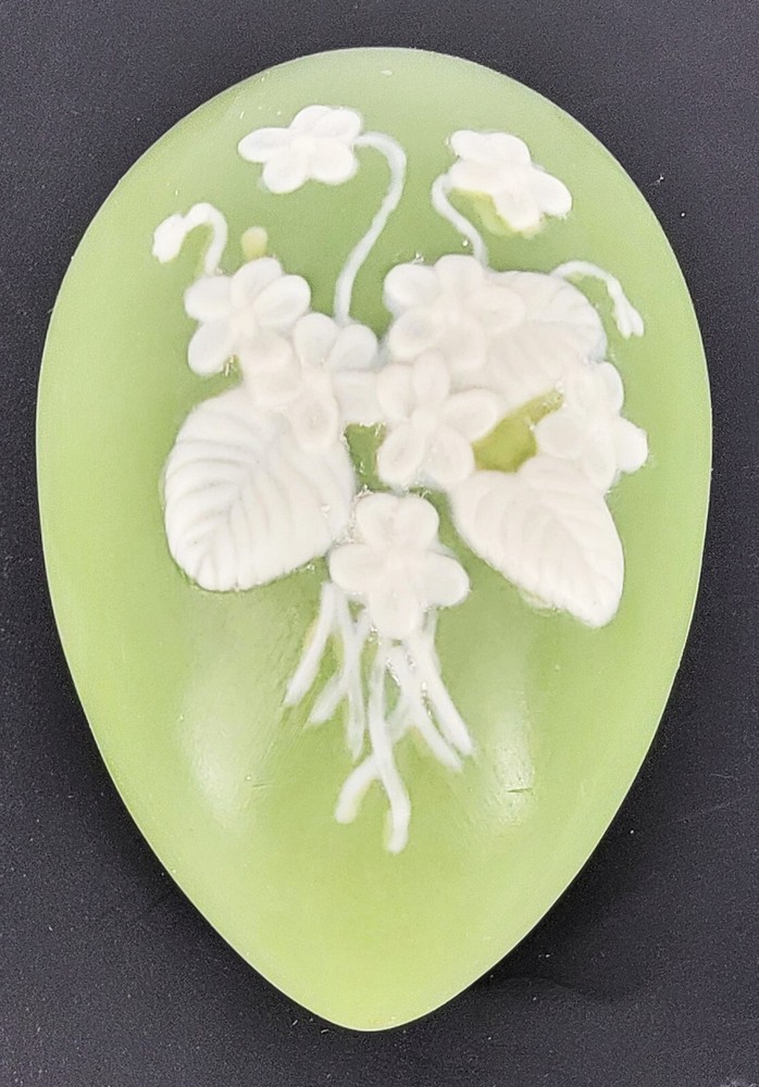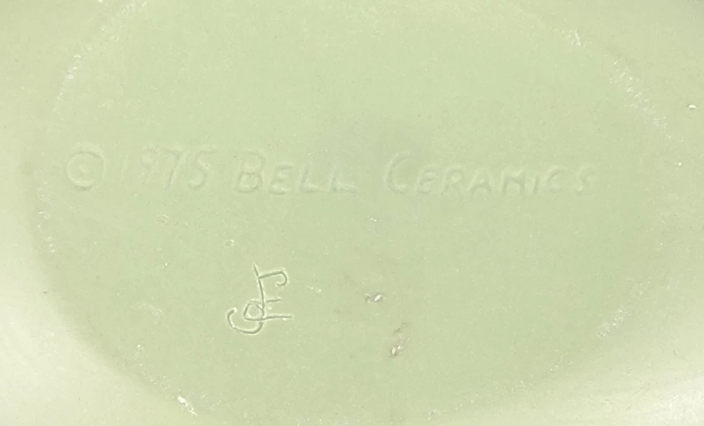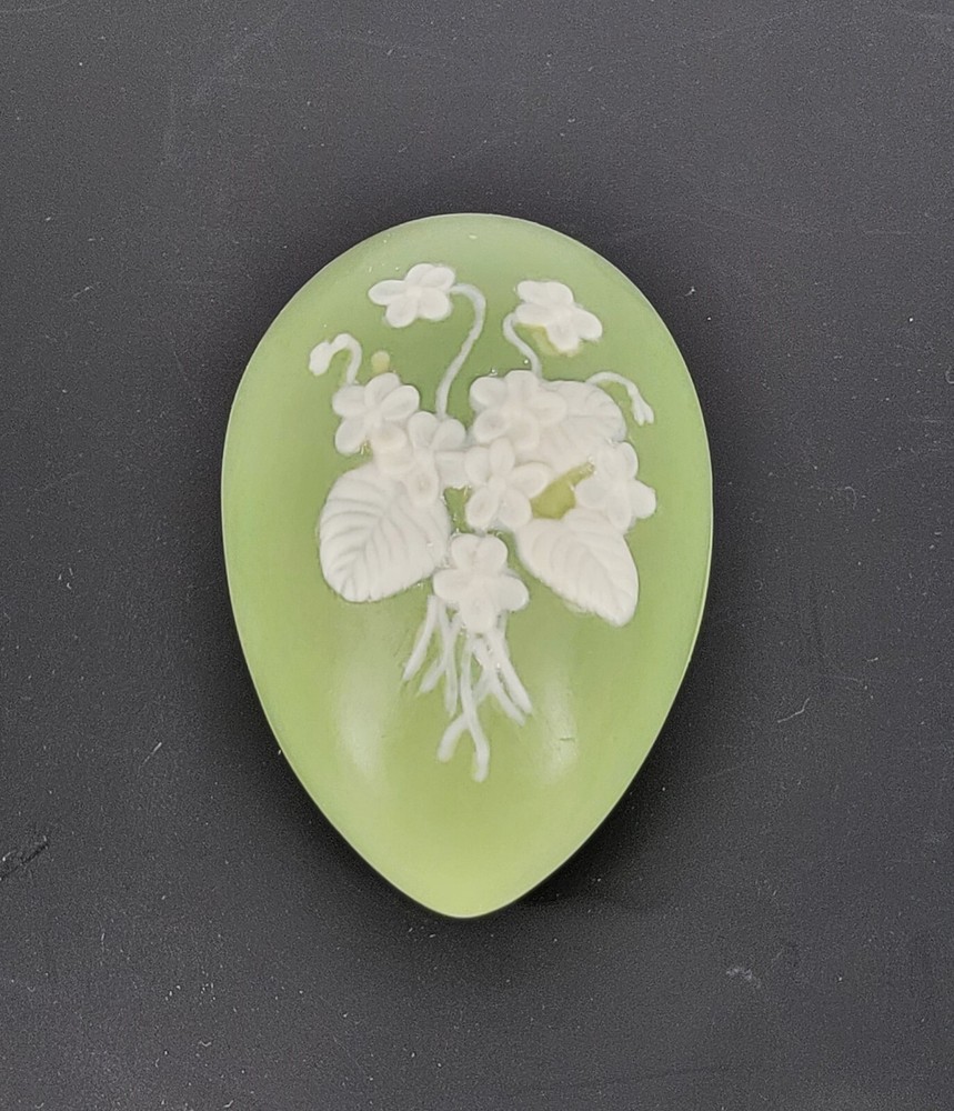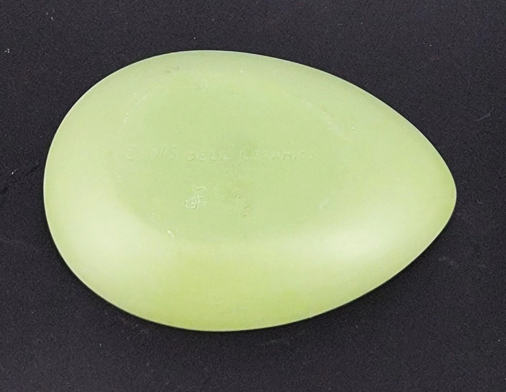 BRAND: 1975 Bell Porcelain Handmade Two Piece Egg/Easter with Raised White Violet Bouquet. Satin Finish, excellent condition! COLORWAY: White, Sage Green. SIZE: Approximately 5" Long, 3" Wide and 3" Tall. CONDITION: Beautiful Sage Green satin finished ceramic egg by Chatham Pottery 1975. It is just lovely with raised white violet bouquet, very romantic. There are no signs of chips, cracks, or damage on this charming trinket dish. It would also make a perfect Easter gift filled with surprises. The finish is very smooth and satiny to the touch. Please see my photos for exact detail. Thank you so much for visiting my store today and please come again!