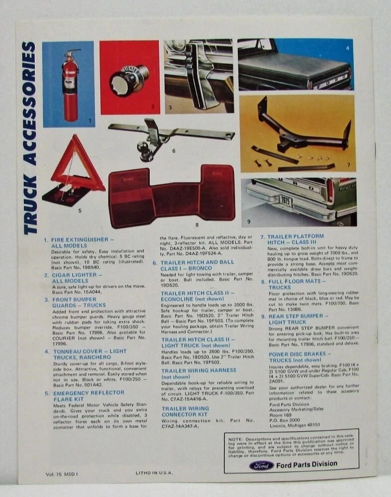 1975 Ford Lincoln Mercury Car and Truck Accessories. Contents: Sound Equipment, Air Conditioners, Travel, Chemicals, Visibility, Appearance and Protection, Safety, Convenience and Maintenance, and Truck Accessories. Pages: 16 Details: W 8.5 x H 11 x D 0.1 Payment is due within 72 hours of purchase. At Troxel’s Auto Literature we do our best to describe items as accurately as possible; that said we ask that you ask all the questions regarding condition or coverage of models before placing a bid or purchasing the item. The best way to ask a question is an e-mail through this listing Thank you, and please check out my other items. Powered by SixBit's eCommerce Solution