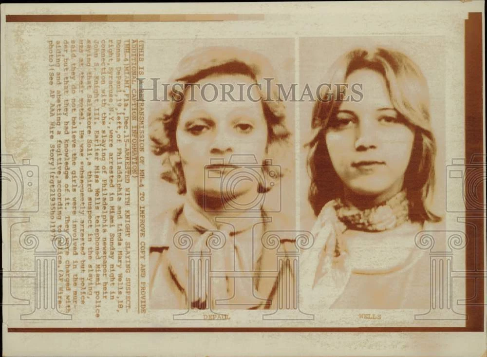 ebay template Note: Please study the images carefully to determine the condition of this vintage photograph, as it may not be in perfect condition. It may contain wrinkles, cracks, and possibly even tears due to its age and how it was handled before it got to us. A scanner may interpret colors and contrast differently than human eyes will, so it is possible that the actual photograph may be slightly darker or lighter in person. This vintage photograph is offered for sale as a collectible item and conveys no transfer of copyright. 1975 Press Photo Donna DePaul, Linda Mary Wells Arrested in John Knight III Case This is an original press photo. Murders - U.S. Miami, Florida, December 15 - Arrested with Knight slaying suspect - Donna DePaul, 19, left, of Philadelphia and Linda Mary Wells, 18, right, Syracuse, New York, were arrested in Miami Sunday night in connection with the slaying of Philadelphia newspaper heir John S. Knight III. Earlier Miss Wells telephoned Miami police saying that Salvatore Soli, a third suspect in the slaying, was at their motel. He was subsequently arrested but police said they do not believe the girls were involved in the murder, but that they had knowledge of it. They were charged with aiding and abetting a fugitive, according to police.Photo measures 11 x 8inches. Photo is dated 12-15-1975. PHOTO FRONT PHOTO BACK Historic Images Part Number: afa23515 FAQs Q: Can I just download a digital version instead? A: No, we sell only vintage originals and do not make or distribute any copies, including digital ones. Q: Do you combine shipping and invoices? A: Multiple photos won on the same seller ID combine automatically through the eBay checkout process. If you encounter problems with this, send us a message via eBay messaging and we will send you an invoice. Due to eBay limitations, we cannot combine items won on our different seller IDs for a single shipping charge. Q: How quickly do you ship the items once paid? A: We ship within one business day after your payment clears. If you do not receive an "order shipped" email from us by the close of the second business day from submitting payment, please e-mail us via eBay messaging. Q: How do you make sure my photograph arrives safely? A: We package each order between two cross-corrugated pieces of cardboard to ensure that the package is as difficult to bend as possible. We then wrap each order in a plastic sheet to help protect against moisture. We want you to rest assured that we take every precaution to ensure that the photograph you receive will be in the same condition in your care as it was in ours. Q: Will the "Historic Images" watermark be on my photo when I receive it? A: No. This is a digital watermark we use to protect our images. It is not printed on the photo. Q: What are your office hours? A: eBay for us is a business, and a very fun one to be in! We are open M-F 9 to 5 (CST). Therefore, we do not return e-mails and phone calls over the weekend. We observe the following holidays: New Years Day, Memorial Day, Fourth of July, Labor Day, Thanksgiving and the day after Thanksgiving, Christmas Eve and Christmas Day. Q: Where did all these vintage photos come from? A: These original vintage photographs are from various news service and newspaper photo archives from locations around the country including: Boston, Detroit, Tampa, Chicago, Denver, Seattle, New Orleans, Milwaukee, Portland, Spokane, and more. We do not copy or reproduce any photographs -- every item is a unique vintage piece that was housed in a news archive. Q: Can I use this photograph in my book/blog/website? A: The short answer is no. There is no transfer of copyright for republication or reproduction with these photographs when you purchase them, and only photographs taken before 1923 are currently automatically in the public domain. Permission from the copyright holder, which usually can be identified from the back of each photo, must be sought to republish or reproduce the image for any purpose. Q: Do you relist items (in case I miss an auction ending)? A: Auction items that receive no bids are relisted in our store (historicimages-store on eBay) as a fixed-price item and at a higher price than the starting auction price. Q: Do you leave feedback? A: Yes, we always leave feedback for buyers. Our software monitors when our buyers leave us feedback, then notifies us that we can leave feedback for the buyer. Rest assured, if you leave feedback, we will do the same! Check out our family of eBay IDs: historicimages01 Sports Photos historicimages02 Entertainment Photos historicimages03 Americana Photos historicimages04 International & War Photos historicimages05 Transportation Photos historicimages06 Photos of All Subjects historicimages07 Entertainment Photos historicimages08 Newsworthy Photos historicimages09 Entertainment Photos historicimages10 Sports Photos historicimages-store Our largest fixed-price selection historicimages-gallery Hand-picked photos Saturday night auctions About Us Historic Images was formed in September 2009, with a handful of scanners working out of a basement to digitize newspaper photo archives. We have since moved out of the basement, and we can now archive thousands of photos per day. Our company has worked with magazines and newspapers from Detroit, Boston, Denver, Seattle, Tampa, Chicago, and New Orleans, just to name a few. We are constantly adding to our inventory, and have assembled an archive of millions of photos to date. As our company evolved, we began our eBay business, which brings thousands of fresh auctions per week to the world's largest online auction marketplace. Our custom software systems and team of great employees allow us to efficiently scan and sell large photo archives online. At the very core of our company's DNA is a strong commitment to customer satisfaction and strict integrity for our product. Our promise to you is that we will do everything in our power to provide you a great buying experienc