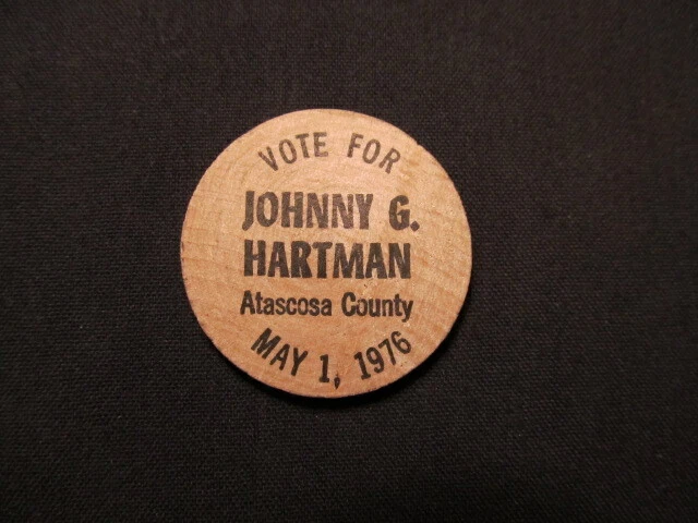 1976 Atascosa County, Texas Wooden Nickel Token - Vote For Johnny G. Hartman Wooden Nickel Coin - TX Wood Token - See the photos for description and condition, and judge for yourself. I do combine shipping on all of my auctions. Please wait for my invoice if you win multiple auctions. Your purchase will be shipped safely in bubble wrap and padded envelope. Thanks for looking!