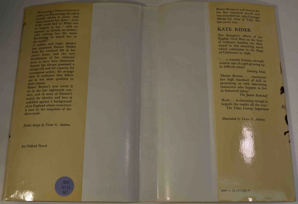 TO RAVENSRIGG Written by Hester Burton. Published by Oxford University Press, London. Copyright 1976; “First published 1976” is stated on the copyright page with no other printing dates noted—a first edition. From Wikipedia: Hester Burton (6 December 1913 – 17 September 2000) was an English writer, mainly of historical fiction for children and young adults. She received the Carnegie Medal for her 1963 novel Time of Trial, which like many of her books was illustrated by Victor Ambrus. DESCRIPTION: 148 pages 8 3/4 x 5 5/8 inches first edition hardcover with dustjacket CONDITION: This hard-cover book is in very good condition with a near fine dust jacket. The blue cloth hardcover is clean and shows only slight wear at the corners and spine ends. There is a name printed at the top of the front pastedown. The front endpaper has been torn out. The interior is otherwise excellent with no marks, underlining, tears creases, foxing or odor. The hinges and binding are excellent with no loose or missing pages. The dust jacket is complete with price intact on the front flap, There is slight rubbing of the edges. There is a bit if a crease along the front edge near the spine, but I think this is a production “flaw” and not caused by any use. This dust jacket will come protected in a new Brodart mylar dust jacket protector. From the dust jacket description: ’Ravensrigg? Where in heaven’s name was Ravensrigg, she asked herself, almost in panic. And what awaited her there —even if she could find it? What was to happen to her—with no parents; no friends; no money; with nothing but the name Ravensrigg to attach her to the world?’ A sudden and tragic disaster has separated Emma Hesket from her confined life in her aunt’s home, and the very foundations of her existence seem to have been destroyed. Emmie has always possessed a strong will and the capacity for courageous action; the strange days of confusion that follow are to test these qualities to their utmost. Hester Burton’s new novel is set in the late eighteenth century, and its story of Emmie’s search for identity and love is unfolded against a background of an England whose conscience is torn by the iniquities of the slave-trade. BECAUSE MEDIA RATE SHIPPING IS FREE ON THE BOOKS I SELL, COMBINE THIS WITH OTHER ITEMS FROM MY EBAY STORE. I AM AN EXPERIENCED EBAY SELLER (23+ YEARS) AND SHIPPER WITH 100% (always!--since 1997!) FEEDBACK RATING. ALL ITEMS ARE CAREFULLY AND SECURELY PACKED TO REDUCE OR ELIMINATE DANGER OF CRUSHING AND OR WATER/MOISTURE DAMAGE. ALL BOOKS ARE SHIPPED IN STURDY BOXES WITH TRACKING AND DELIVERY CONFIRMATION INCLUDED. I PERSONALLY GUARANTEE ALL OF THE BOOKS, AUTOGRAPHS AND SIGNATURES ON BOOKS I SELL.
