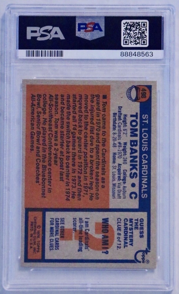 Series:ToppsCard Number:498Set:1976 Toppsbrand:ToppsLeague:National Football League (NFL)Player/Athlete:Tom BanksTeam:St. Louis CardinalsParallel/Variety:[Base]Features:Rookie, Base SetManufacturer:ToppsSeason:1976Sport:Football