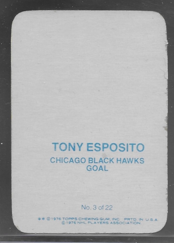 1976-77 Topps - Glossy Inserts #3 Tony Esposito Centering is good, color, and gloss, corners are excellent. Edges on back of card show some light wear or chipping in isolated areas. I do my best to evaluate each card carefully but please examine high resolution photo as price of card is determined by that pic. All cards are shipped in a brand new Ultra-Pro Premium top loader with an Ultra-Pro premium plastic sleeve to protect your card for years. Please read our reviews. Customers are pleased with their card purchases from NMMT Vintage. We are different! Tired of getting horrible packaging of your cards by lazy dealers? Customers rave about our care in shipping and handling your treasure regardless of its value. eBay Standard envelope shipping will have a cardboard support as well as the Ultra-Pro Premium top loader. First class shipping will have two cardboard backers as well as the Ultra-Pro Premium top loader and will be mailed in a bubble envelope.