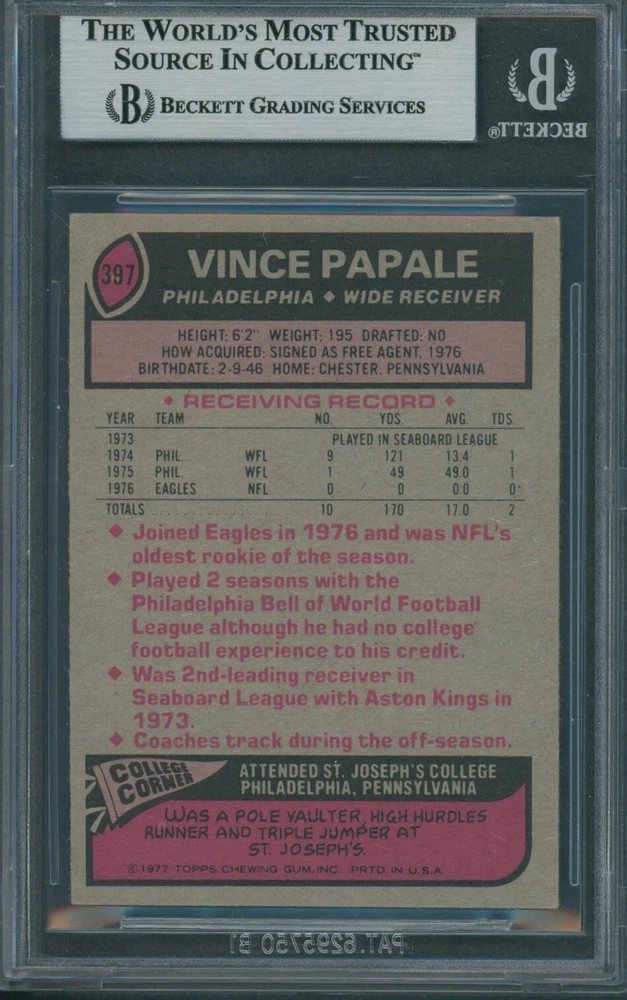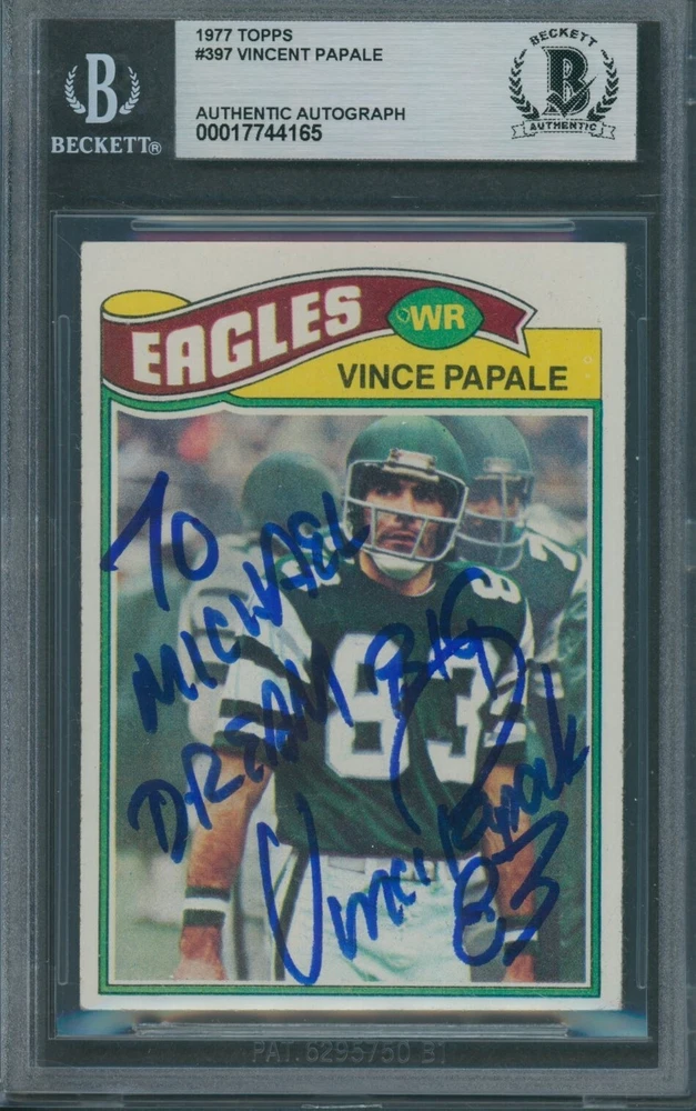Capture a piece of football history with the 1977 Topps Vince Papale #397 sports trading card. This iconic card showcases the Philadelphia Eagles' legend during the height of his career, making it a coveted piece for collectors and fans alike. Its vivid imagery and crisp details transport you back to the golden era of football, allowing you to own a snapshot of sports legacy. Proudly manufactured by Topps, known for their quality and commitment to sports memorabilia, this card is a part of the revered 1977 Topps set. Whether you're expanding your collection or starting a new one, this Vince Papale card is an excellent choice for anyone who appreciates the rich tapestry of football lore.