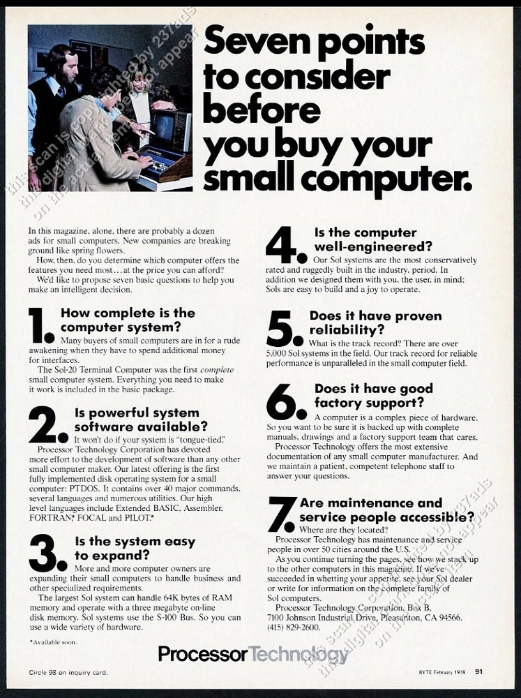 This is an original 1978 print ad for Processor Technology! It measures approximately 11" x 8" overall, has no tears or stains, comes from a dry, high-altitude, smoke-free environment, and is strictly graded "Very Fine". This vintage ad is not any kind of later reproduction, photocopy or reprint (most ads were published at one time only, and never commercially reproduced). An unusual and distinctive piece for your frame. THANK YOU for the opportunity to earn your business. Thank you for helping us celebrate our 19TH YEAR on ebay! Watch for our special 19% off sales through the year. t237HH 306090 We ship worldwide. We will combine as many items in one package as you want, to save shipping costs. Buy 10 or more items and the shipping is FREE. Use the ebay shopping cart so that there is only one payment, please. We ship six days every week, and if your payment arrives before Noon Mountain Time, your package goes out that same day. Our custom-made shipping tubes (33% thicker than standard USPS/office supply store shipping tubes, and bearing our distinctive cat graphic design!) work perfectly for most items, unless the item is too thick or is of the fold-out type; those will need to be shipped flat. All items which are shipped flat come with a clear sleeve and a nice, substantial backing board, not a cheap flimsy one. Who Buys Our Vintage Ads? Over the past 19 years on ebay, our customers have included museums, galleries, national archives, concert halls, corporate archives, universities, TV and film production companies, private collectors and others in over 100 countries on all seven continents-- yes, including a person stationed in Antarctica. If you've seen print ads used in set decoration for TV shows or films, you've likely seen our ads. If you've looked in major store display windows in New York at Christmastime, you've likely seen our ads. We've been lucky enough to have worked with some of the best in a wide variety of industries, and are looking forward to working with you too. Please let us know if you have any questions prior to purchase. Powered by SixBit's eCommerce Solution