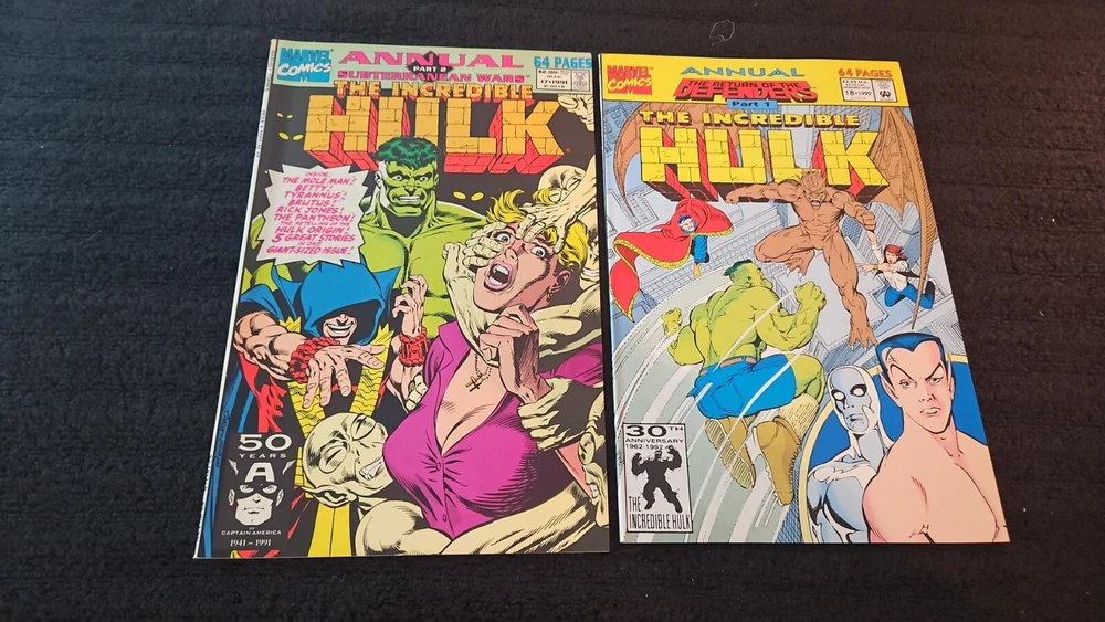 PLEASE VISIT MY EBAY STORE FOR MORE LISTINGS NEW SHIPPING POLICY: FIRST ORDER IS $6.99 THEN 65 CENTS FOR EACH ADDITIONAL ORDER. ALL ITEMS SHIPPED GROUND ADVANTAGE WITH $100 INSURANCE. IF YOU WOULD LIKE TO ADD ADDITIONAL INSURANCE PLEASE CONTACT ME BEFORE SUBMITTING PAYMENT. To receive shipping discount, ALL ITEMS MUST BE PAID FOR IN ONE TRANSACTION. If you pay for items individually, I will not give a refund of shipping charges due to the fees from eBay and PayPal. PAYMENT POLICY: ALL ITEMS MUST BE PAID FOR WITHIN 2 DAYS OF ITEM END. ON THE 3RD DAY AN UNPAID ITEM CASE WILL BE OPENED AND AT THAT POINT NO ADDITIONAL ITEMS CAN BE ADDED TO THAT ORDER. ANY ADDITIONAL ITEMS WILL BE INVOICED SEPARATELY. YOU ARE BIDDING ON A MARVEL COMICS LOT OF 7 INCREDIBLE HULK ANNUALS. ISSUES INCLUDE: #8 NEWSSTAND (1979) #12 (1983) #13 (1984) #14 (1985) #15 (1986) #17 (1991) #18 (1992) MID TO HIGH GRADE. (SEE PICS). BAGGED ONLY NO BOARDS. WE USE OVERSTREET GRADING TECHNIQUES, SO PLEASE VIEW ALL PICS AS GRADING IS TOTALLY SUBJECTIVE. *PLEASE READ BELOW BEFORE BIDDING AS I WILL NOT CANCEL ANY BID/ORDER ONCE IT HAS BEEN PLACED* Payment is required within 2 days of auction end. If payment is not received I will open an unpaid item case on the third day. Once an unpaid item case has been opened, no additional items can be added to that order. All items will be shipped within 1 business day of receiving cleared payment. All items are shipped with tracking. I take great care in packaging items for shipment, but the post office does not always take great care with packages. If you would like insurance on your package, please let me know BEFORE submitting payment and I will be happy to add insurance to your invoice. If a package arrives damaged, please let me know and I will send a return shipping label to return the item. I DO NOT OFFER PARTIAL REFUNDS FOR ITEMS DAMAGED IN SHIPPING. RETURNS ONLY. Florida residents will be charged 7% sales tax. FOR ALL INTERNATIONAL CUSTOMERS PLEASE READ. I USE EBAY'S GLOBAL SHIPPING PROGRAM FOR ALL INTERNATIONAL SHIPMENTS. THE SHIPPING CHARGES I CHARGE ARE FOR US SHIPPING ONLY TO THE GLOBAL SHIPPING CENTER. EBAY SETS THE INTERNATIONAL SHIPPING RATES AND ALSO ANY IMPORT FEES. I HAVE NO CONTROL OVER THOSE CHARGES. EBAY ALSO DOES NOT ALLOW ME TO COMBINE SHIPMENTS. THERE IS NO COMBINED SHIPPING OR SHIPPING DISCOUNT ON ANY INTERNATIONAL SHIPMENTS. ALL INTERNATIONAL SHIPMENTS WILL BE INVOICED SEPARATELY.