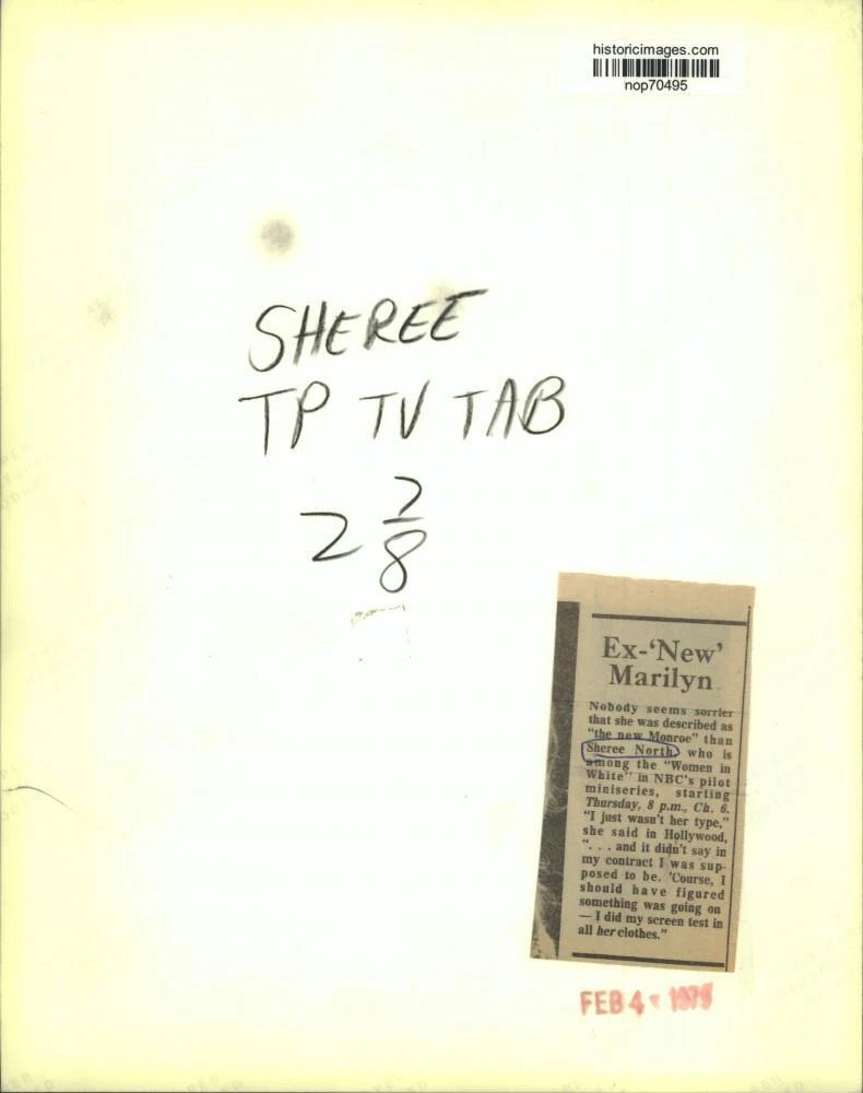 ebay template Note: Please study the images carefully to determine the condition of this vintage photograph, as it may not be in perfect condition. It may contain wrinkles, cracks, and possibly even tears due to its age and how it was handled before it got to us. A scanner may interpret colors and contrast differently than human eyes will, so it is possible that the actual photograph may be slightly darker or lighter in person. This vintage photograph is offered for sale as a collectible item and conveys no transfer of copyright. 1979 Press Photo Hollywood's ex-new Marilyn stars in "Women In White," on NBC-TV This is an original press photo. Ex-'New' Marilyn-Nobody seems sorrier that she was described as "the new Monroe" than Sheree North, w ho is among the "Women in White" in NBC's pilot miniseries starting Thursday, 8 p.m., Ch. 6. "I just wasn't her type," she said in Hollywood,"...and it didn't say in my contract I was supposed to be. 'Course I should have figured something was going on--I did my screen test in all her clothes.Photo measures 8 x 10inches. Photo is dated 02-04-1979. PHOTO FRONT PHOTO BACK Historic Images Part Number: nop70495 Sell Smarter with Kyozou. Inventory and Ecommerce Management