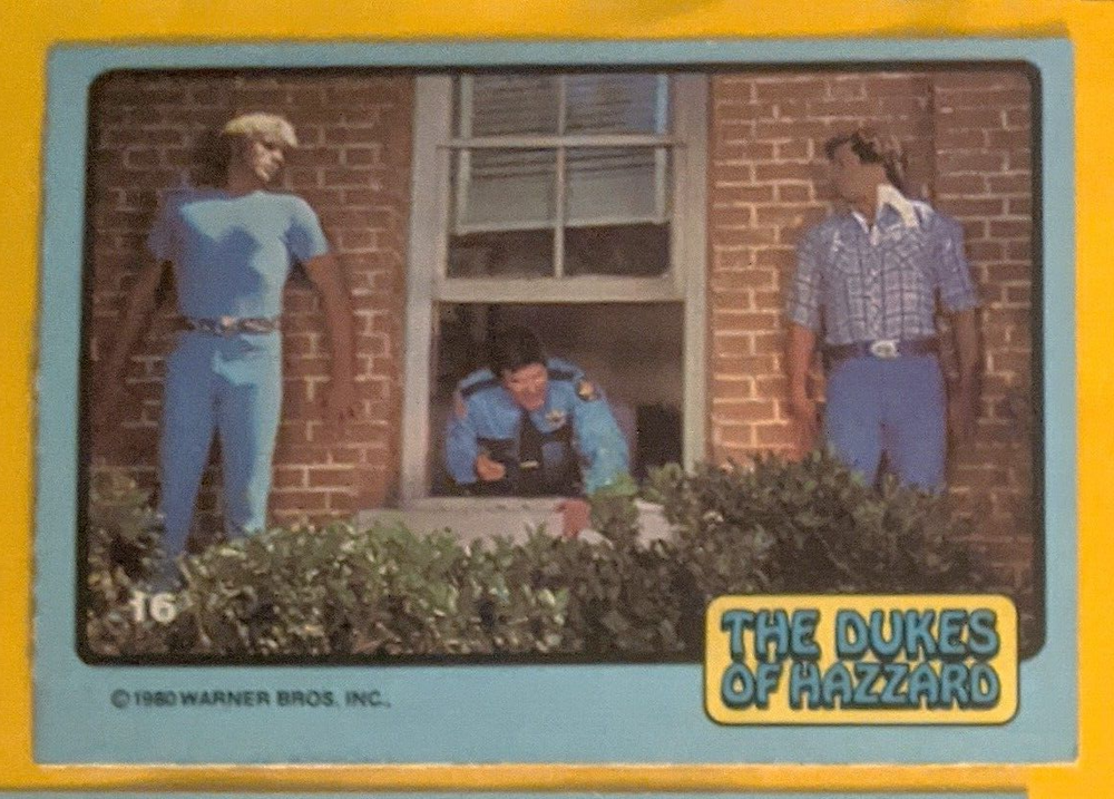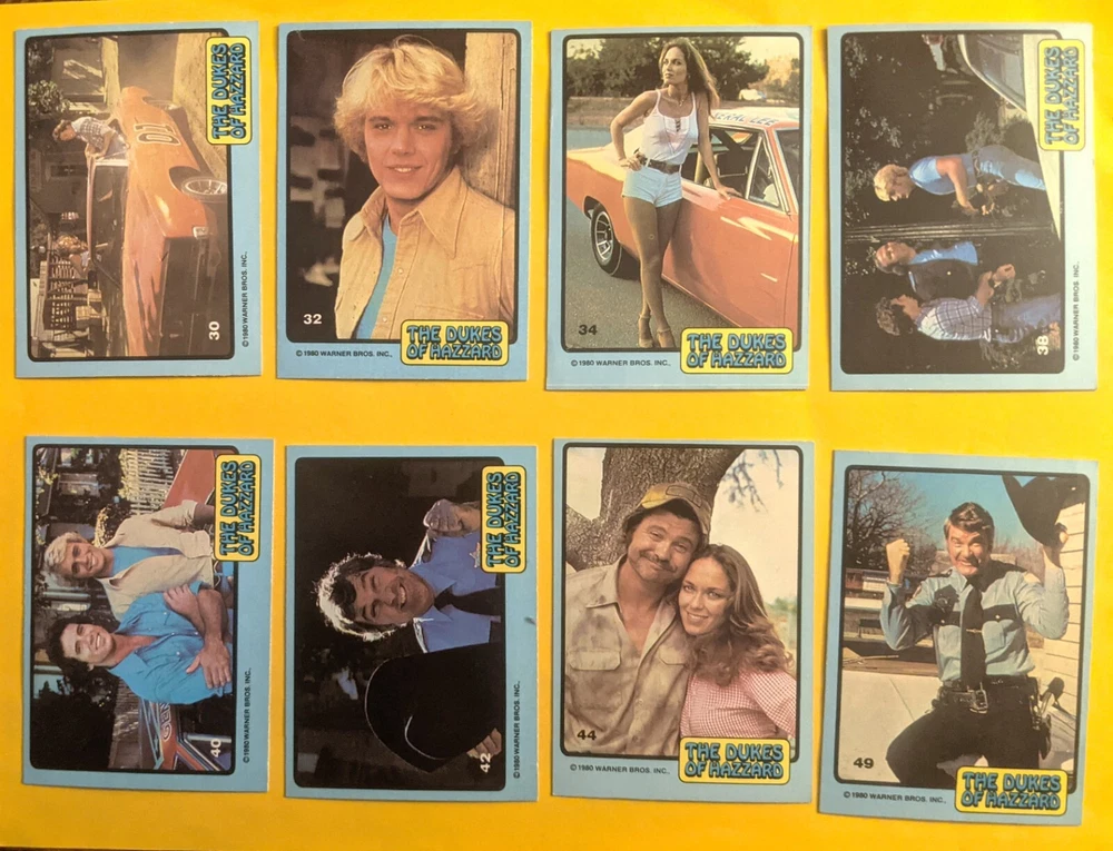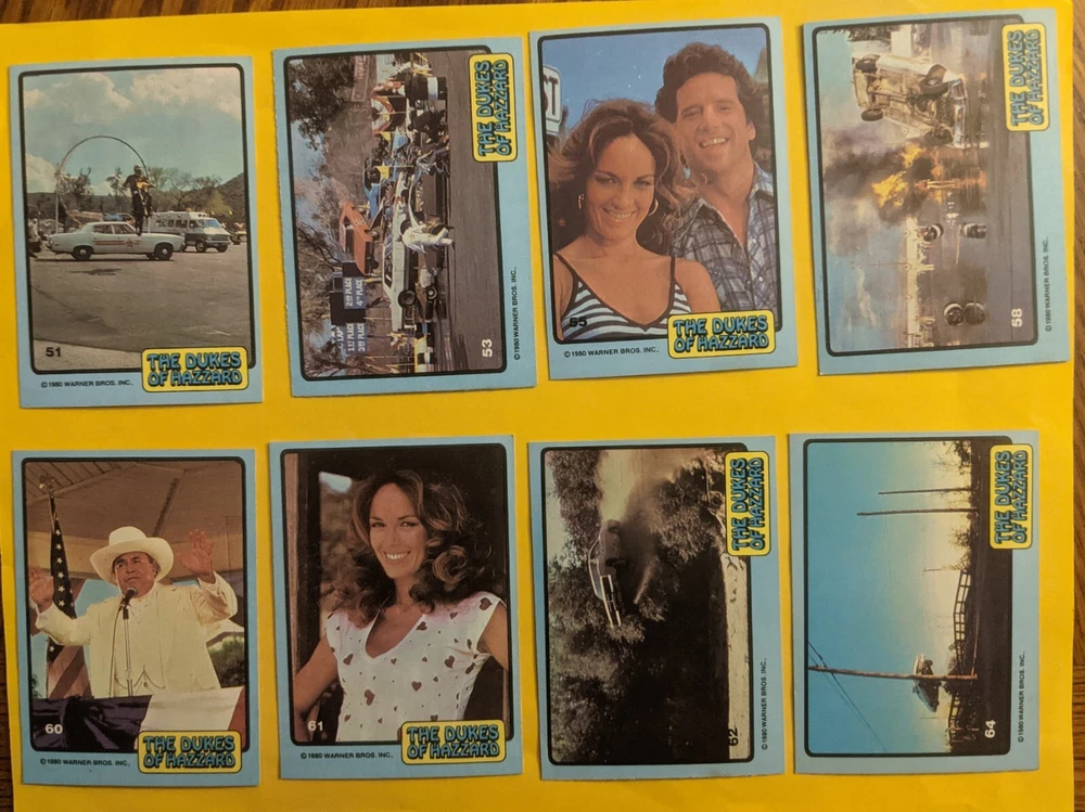1980 Donruss non sport Duke of Hazzard singles $1.25 each (min order $2.50). Numbers 10, 11, 12, 16, 26, 29, 30, 32, 34, 38, 40, 42, 44, 49, 50, 51, 53, 55, 58, 60, 61, 62, 64.