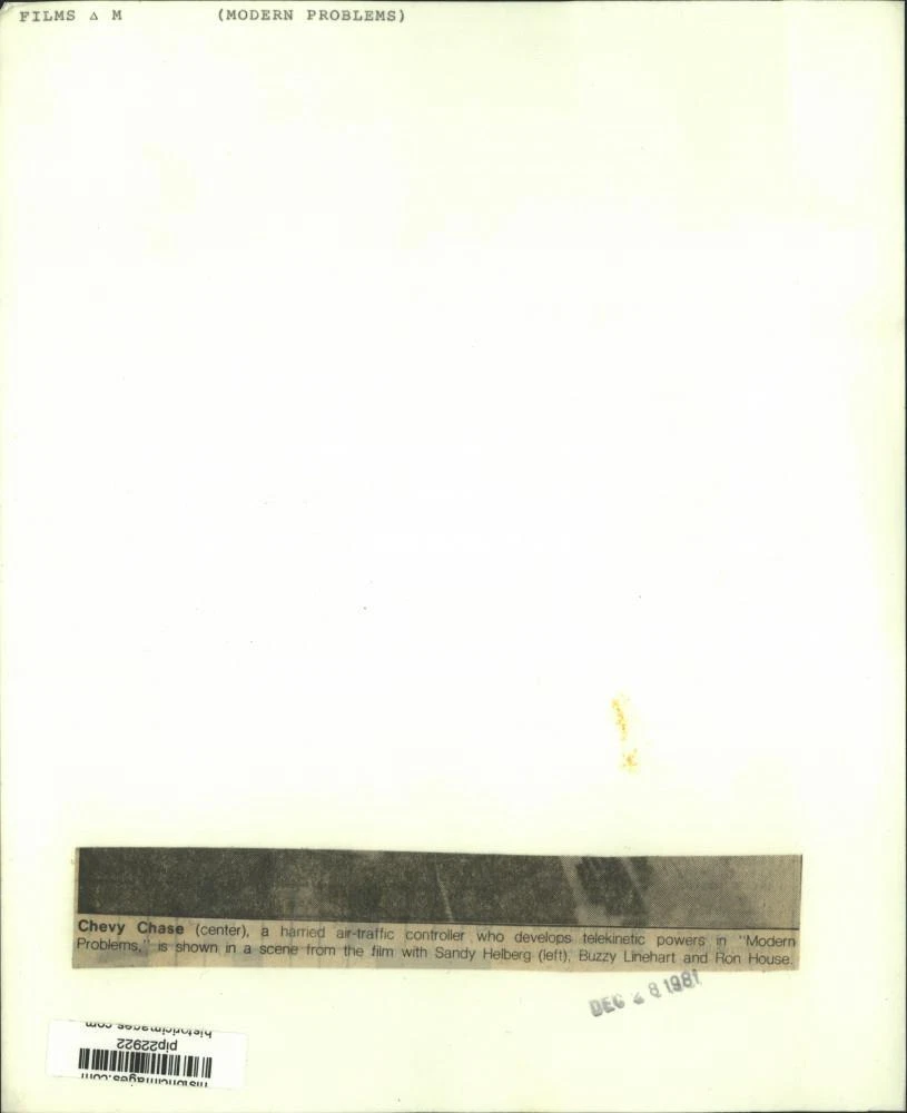 ebay template Note: Please study the images carefully to determine the condition of this vintage photograph, as it may not be in perfect condition. It may contain wrinkles, cracks, and possibly even tears due to its age and how it was handled before it got to us. A scanner may interpret colors and contrast differently than human eyes will, so it is possible that the actual photograph may be slightly darker or lighter in person. This vintage photograph is offered for sale as a collectible item and conveys no transfer of copyright. 1981 Press Photo "Modern Problems" Air Traffic Control Tower Scene - pip22922 This is an original press photo. Films - M ("Modern Problems"). Twentieth Century-Fox presents "Modern Problems." Chevy Chase, center) is a harried air traffic controller whose life is falling apart - until he develops telekinetic powers to strike back at the people who are driving his crazy. Sandy Helberg (left), Buzzy Linehart (back, center) and Ron House (right).Photo measures 10 x 8inches. Photo is dated --1981. PHOTO FRONT PHOTO BACK Historic Images Part Number: pip22922 Sell Smarter with Kyozou. Inventory and Ecommerce Management