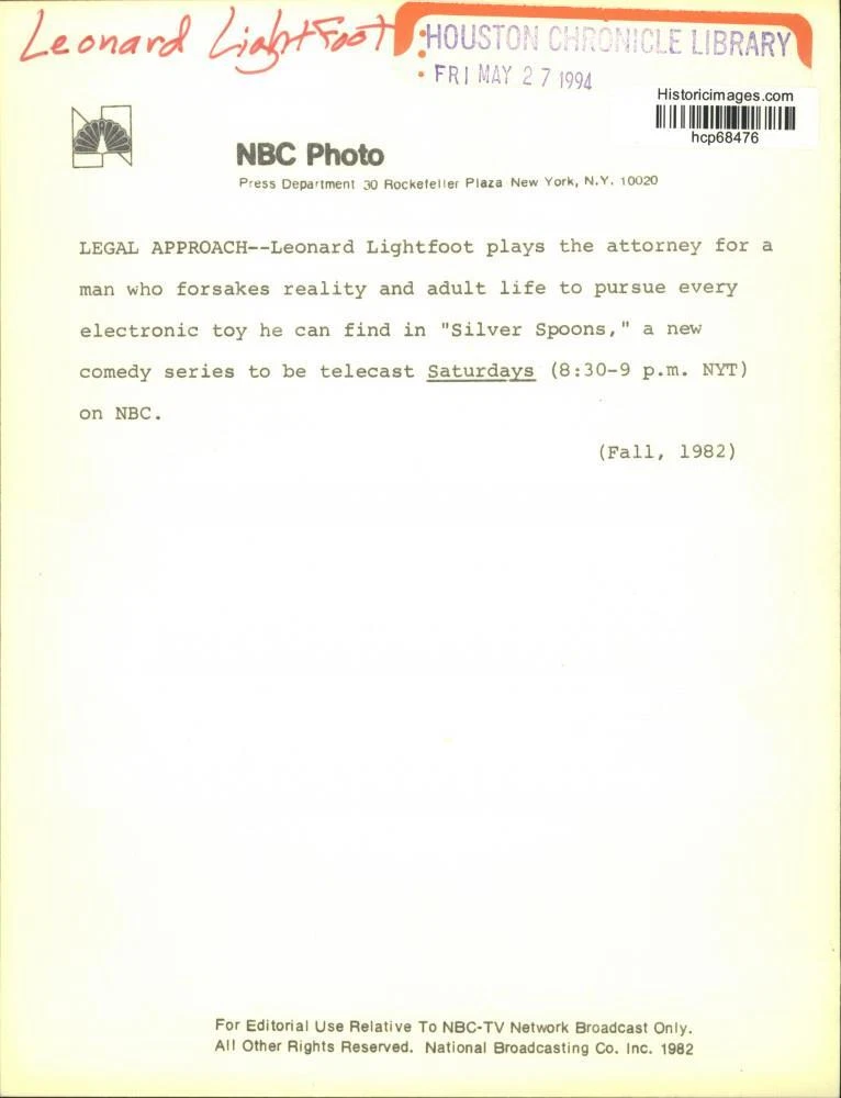 ebay template Note: Please study the images carefully to determine the condition of this vintage photograph, as it may not be in perfect condition. It may contain wrinkles, cracks, and possibly even tears due to its age and how it was handled before it got to us. A scanner may interpret colors and contrast differently than human eyes will, so it is possible that the actual photograph may be slightly darker or lighter in person. This vintage photograph is offered for sale as a collectible item and conveys no transfer of copyright. 1982 Press Photo Leonard Lightfoot in "Silver Spoons" NBC Series - hcp68476 This is an original press photo. Leonard Lightfoot plays the attorney for a man who forsakes reality and adult life to pursue every electronic toy he can find in "Silver Spoons," a new comedy series to be telecast Saturdays (8:30-9 p.m. NYT) on NBC.Photo measures 7 x 9.25inches. Photo is dated --1982. PHOTO FRONT PHOTO BACK Historic Images Part Number: hcp68476 Sell Smarter with Kyozou. Inventory and Ecommerce Management