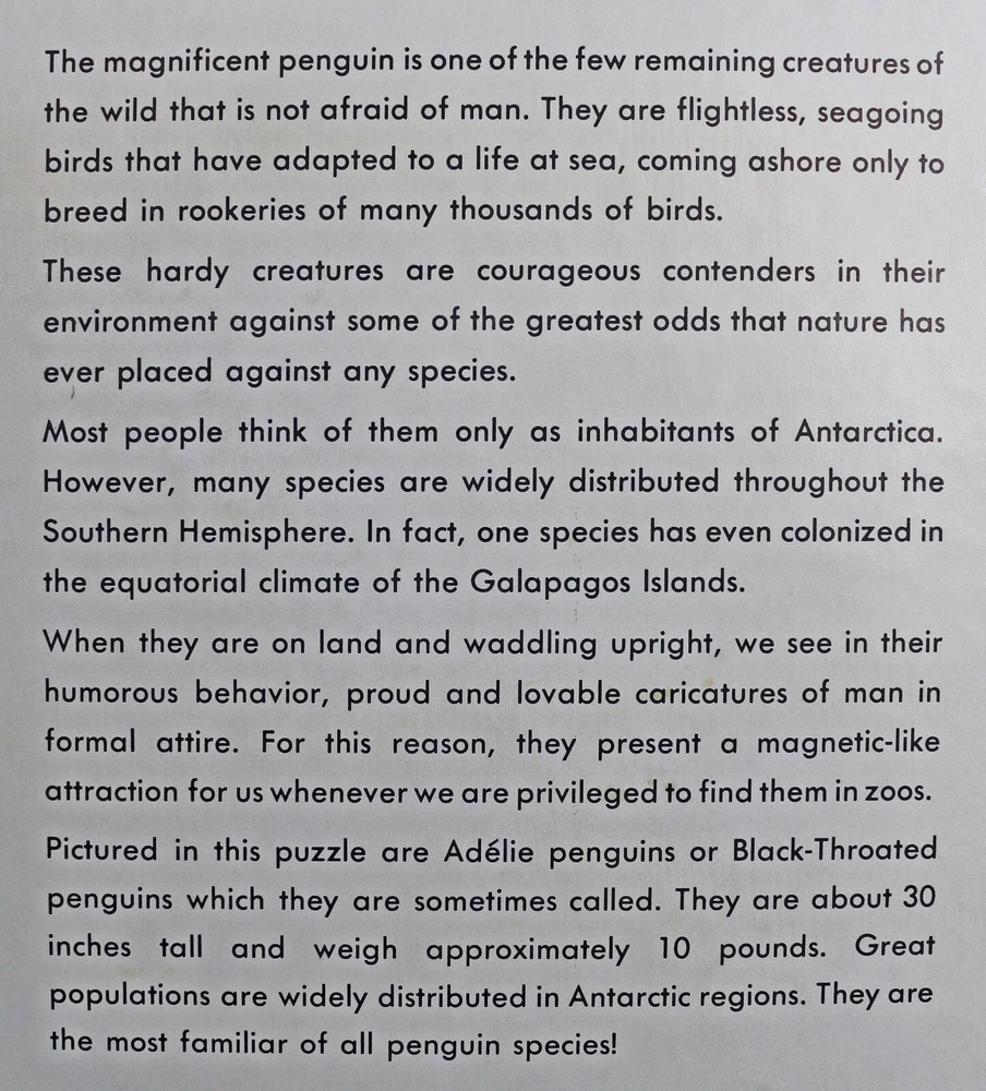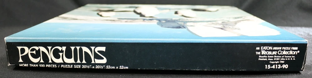 This vintage Eaton jigsaw puzzle from 1982 features adorable penguins and measures 20.5" x 20.5". With over 500 pieces, this puzzle is perfect for puzzle enthusiasts of all ages and skill levels. The puzzle is made of high-quality cardboard and is interlocking, making it easy to assemble. In addition, this puzzle is from a smoke-free home and comes complete with all pieces included. It is recommended for ages 10+ and has been manufactured in the United States. This puzzle is a great addition to any collection or a fun activity for anyone who loves puzzles or penguins. Doing puzzles has some hidden benefits Excellent qualities : Cultivate concentration, patience, and temper your will Movement development : Train hand-eye coordination and precise small movements Spatial intelligence : Improve visual discrimination of colors and shapes Critical thinking ability : Understand the relationship between parts and the whole, and draw inferences from one example to explore the future Relaxes your mind : Relieve work pressure and release yourself Brain development : Enhance memory and may help prevent or slow brain degeneration Puzzle pieces are all bagged. Each item we ship is carefully packaged to prevent any damage and is shipped immediately with tracking. Anticipated Benefits of Puzzles for Children Overcoming attention deficit Strengthening visual memory Improving problem solving skills Strengthening hand-eye coordination Improve fine motor skills Improve gross motor skills Shape recognition ability Gain the ability of setting goals Learning patience
