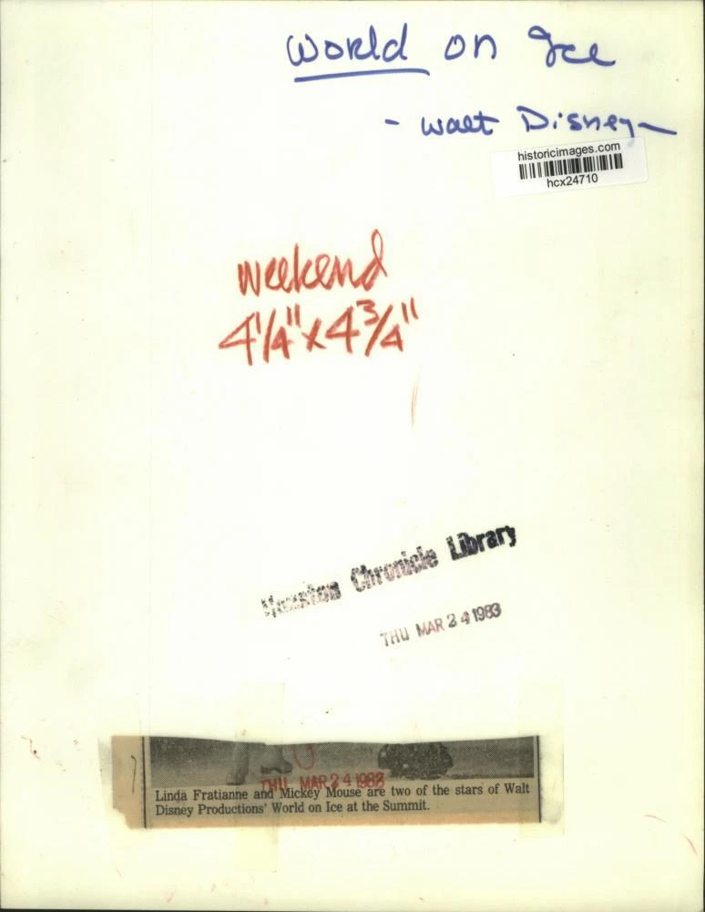 ebay template Note: Please study the images carefully to determine the condition of this vintage photograph, as it may not be in perfect condition. It may contain wrinkles, cracks, and possibly even tears due to its age and how it was handled before it got to us. A scanner may interpret colors and contrast differently than human eyes will, so it is possible that the actual photograph may be slightly darker or lighter in person. This vintage photograph is offered for sale as a collectible item and conveys no transfer of copyright. 1983 Press Photo Olympic Medalist Linda Fratianne and Mickey Mouse, World On Ice This is an original press photo. World On Ice - Olympic Silver Medalist Linda Fratianne and Mickey Mouse are two of the stars of Walt Disney Productions' World on Ice at the Summit. Photo measures 8 x 10.25 inches. Photo is dated 03-24-1983. PHOTO FRONT PHOTO BACK Historic Images Part Number: hcx24710 Sell Smarter with Kyozou. Inventory and Ecommerce Management