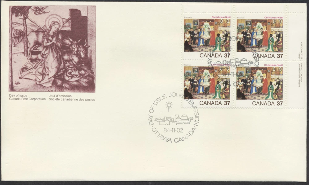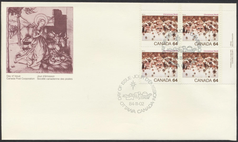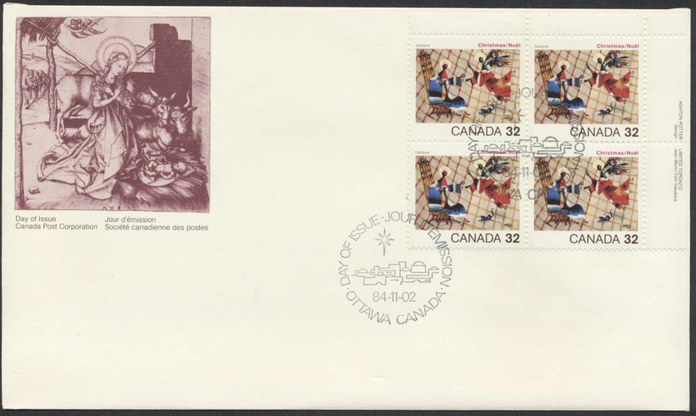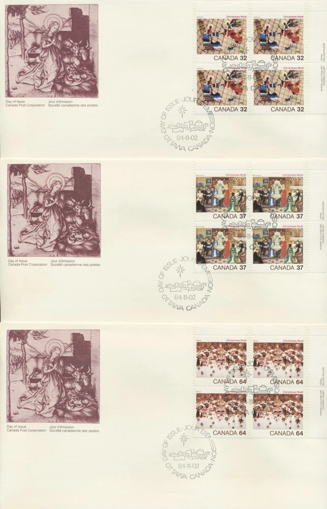 1984 #1040-1042 Set of 3 Christmas FDCs, UR Plate Blocks, CPC Cachets