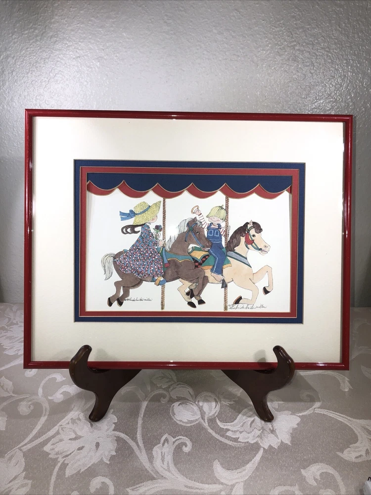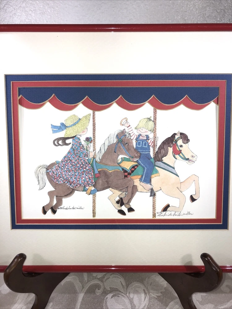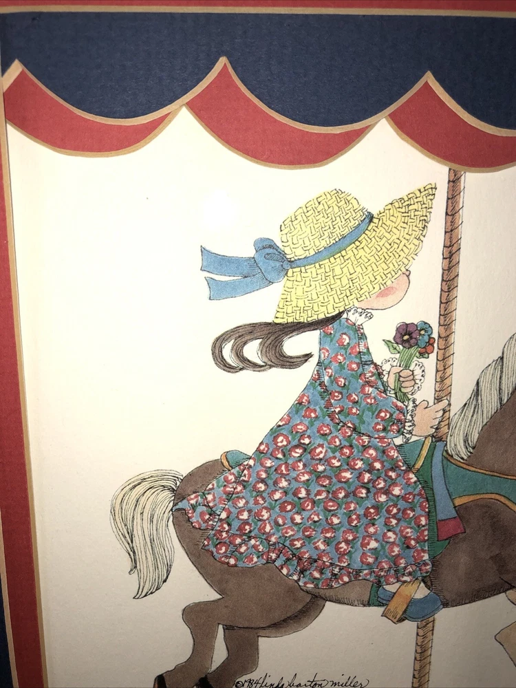 1984 Linda Barton Miller limited edition pen and watercolor lithograph print of “Children on the Carrousel” (or “Grabbing the Brass Ring”—your choice). Signed and autographed in pencil. Issue 459/500. Preowned. Custom matted and metal frame. Custom matting enhances the image experience. Some nicks and superficial scratches are visible on the frame surface. Otherwise very well preserved. No fading or foxing. While not rare, this print is difficult to find on various reseller platforms. The last one reported sold was in May 2016 (159/500), unframed and un-matted. Highly collectible children’s prints. Print image area measures 9”W X 6”T. Frame measurements can be found in the description above. Framed print weighs 2 lbs 5.4 ounces.
