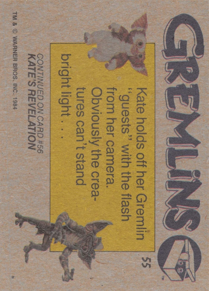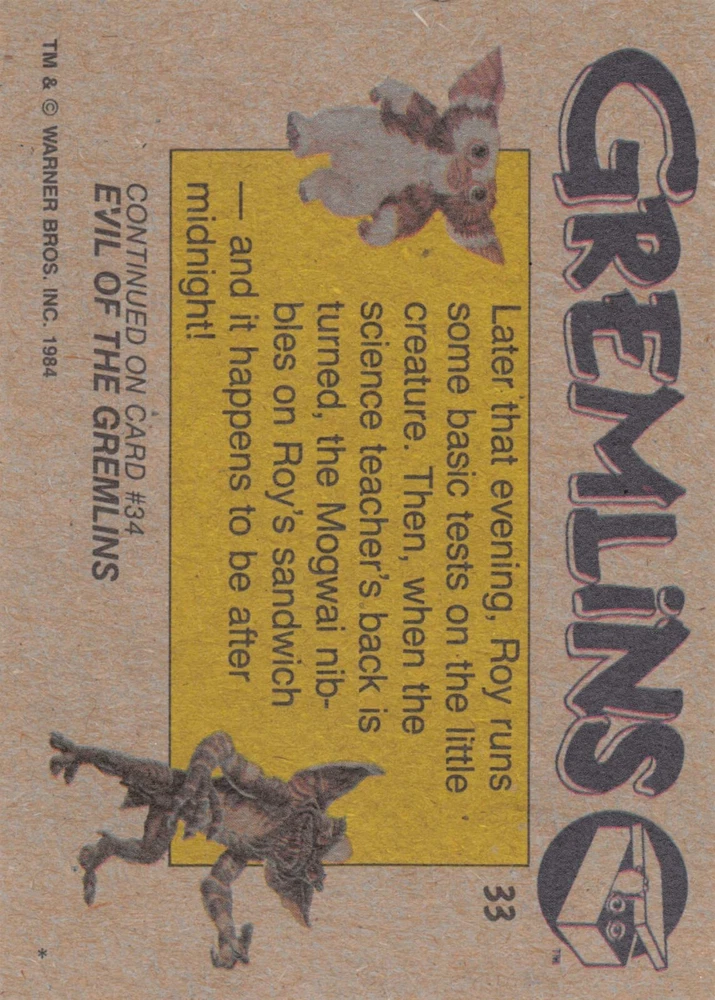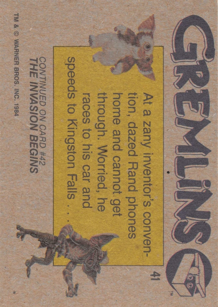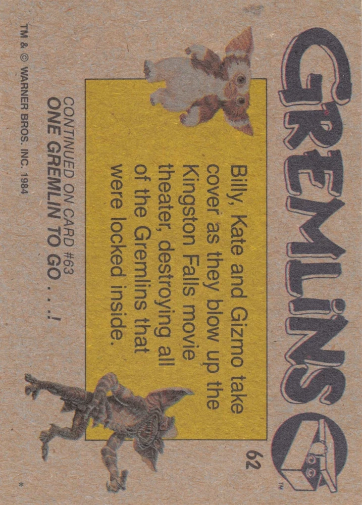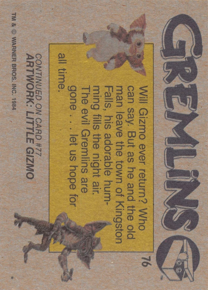 This listing is for your choice of any available 1984 Topps Gremlins card, sticker or wrapper from the drop-down menu above. Photos show front and backside of each card, be sure to scroll sideways to view front and backside photos! Any questions? Please ask before buying. International "USPS First Class Mail" will not include a tracking number for this item, if you would like a tracking number please choose the "eBay International Standard Shipping" option when you check out. As with all of my "pick-a-card" listings, I will be shipping with "eBay Standard Envelope". The rules of this envelope state that it cannot be too thick, so please expect your order to be packaged as follows: 1 to 6 cards will be slid into a single sleeve, the sleeve will then be slid inside of a semi-rigid Card-Saver. 7 to 12 cards will be slid into a double sleeve, 13 to 18 cards into a triple sleeve, 19 to 24 cards into a quadruple sleeve(up to six cards per sleeve). The double, triple and quadruple sleeve shipping will not have the Card-Saver. If you buy more than 1 card and want it packaged with more than 1 Card-Saver(or 1 sleeve per card), I kindly ask that you contact me before purchasing to be sure that this is possible to have it done with the stated shipping charge, or if additional shipping would be required. If you do not contact me, then you can expect to receive your order packaged as I have explained here. Please do not expect rigid top-loaders to be included, I don't normally keep a lot of them in stock, but if you message me prior to ordering I will be able to see if I have any that can be included with your order - additional shipping may be required. In order to get free combined shipping from this and any of my other "pick-a-card" listings, you must add all of your cards to the cart and check out when you are done shopping. If you do not use the cart you will be overpaying on shipping and I cannot refund you on over-payed shipping. So please use the cart and get your FREE COMBINED SHIPPING!