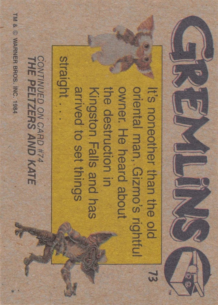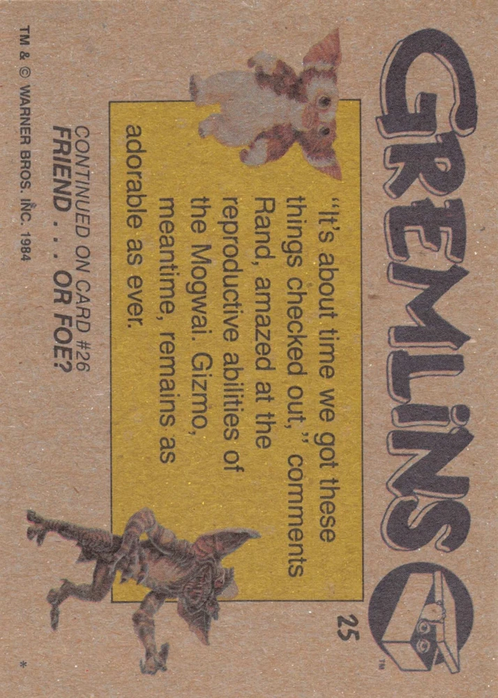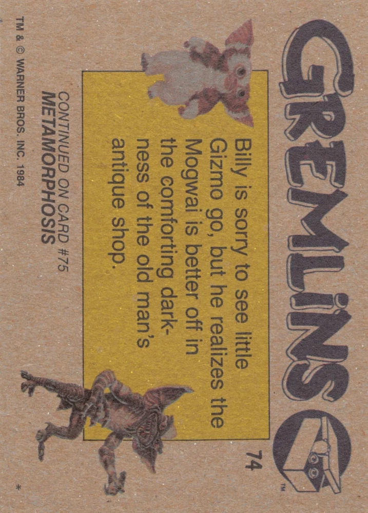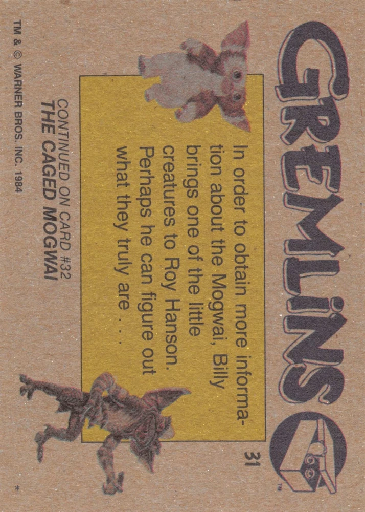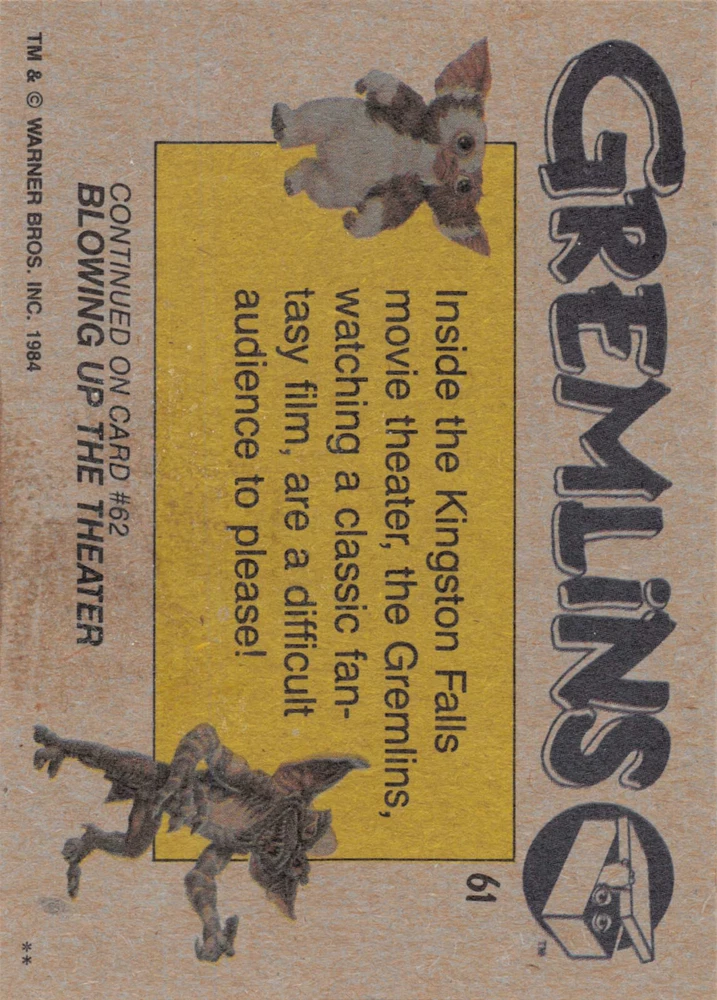 This listing is for your choice of any available 1984 Topps Gremlins card, sticker or wrapper from the drop-down menu above. Photos show front and backside of each card, be sure to scroll sideways to view front and backside photos! Any questions? Please ask before buying. International "USPS First Class Mail" will not include a tracking number for this item, if you would like a tracking number please choose the "eBay International Standard Shipping" option when you check out. As with all of my "pick-a-card" listings, I will be shipping with "eBay Standard Envelope". The rules of this envelope state that it cannot be too thick, so please expect your order to be packaged as follows: 1 to 6 cards will be slid into a single sleeve, the sleeve will then be slid inside of a semi-rigid Card-Saver. 7 to 12 cards will be slid into a double sleeve, 13 to 18 cards into a triple sleeve, 19 to 24 cards into a quadruple sleeve(up to six cards per sleeve). The double, triple and quadruple sleeve shipping will not have the Card-Saver. If you buy more than 1 card and want it packaged with more than 1 Card-Saver(or 1 sleeve per card), I kindly ask that you contact me before purchasing to be sure that this is possible to have it done with the stated shipping charge, or if additional shipping would be required. If you do not contact me, then you can expect to receive your order packaged as I have explained here. Please do not expect rigid top-loaders to be included, I don't normally keep a lot of them in stock, but if you message me prior to ordering I will be able to see if I have any that can be included with your order - additional shipping may be required. In order to get free combined shipping from this and any of my other "pick-a-card" listings, you must add all of your cards to the cart and check out when you are done shopping. If you do not use the cart you will be overpaying on shipping and I cannot refund you on over-payed shipping. So please use the cart and get your FREE COMBINED SHIPPING!