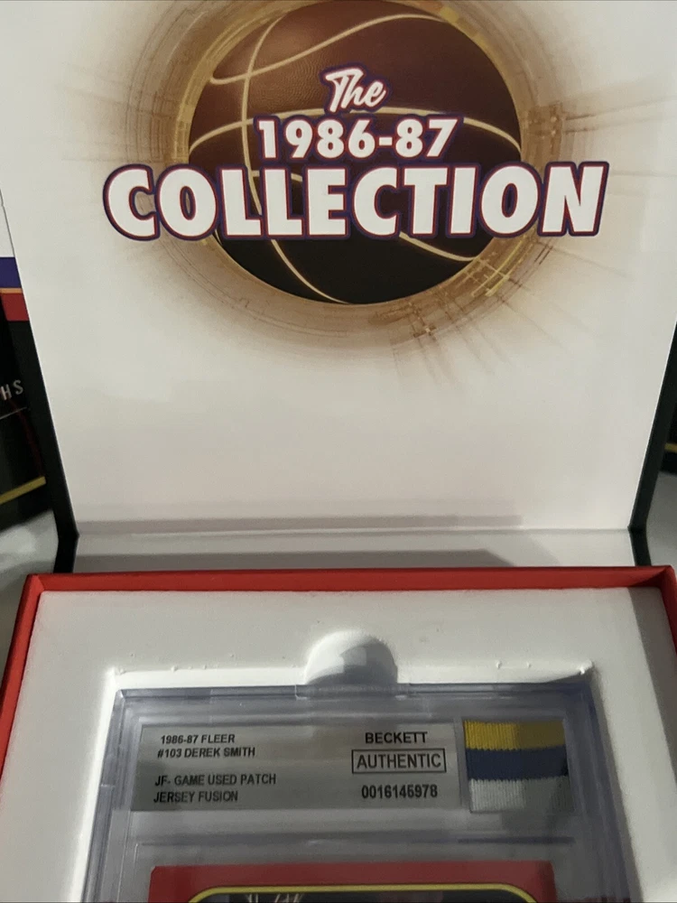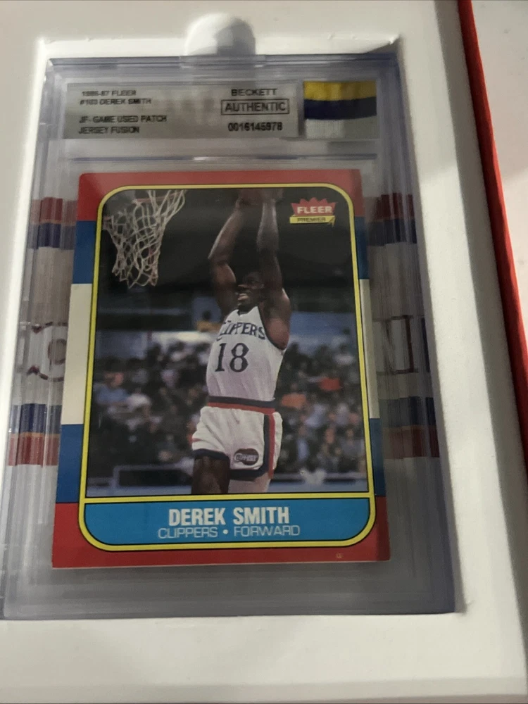 This 1986-87 Fleer basketball trading card features Derek Smith of the Los Angeles Clippers. The card is part of the Jersey Fusion set and includes a genuine patch of Smith's jersey. It is a standard-sized card and has not been autographed. The card is in English and was manufactured by Fleer in the United States. In addition to the base set, this card also falls under the Collectors Edition and Memorabilia categories. The card number is 103 and it is from the 1986-87 season. This patch variety card is a must-have for any basketball trading card collector.