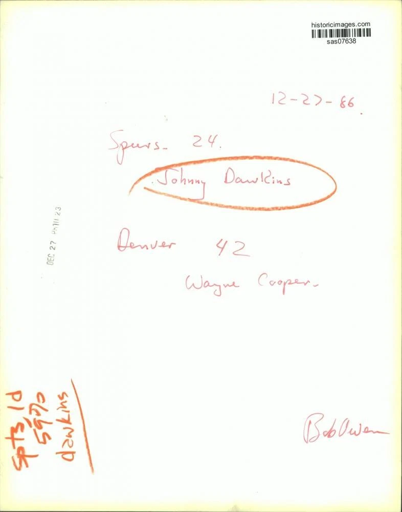 ebay template Note: Please study the images carefully to determine the condition of this vintage photograph, as it may not be in perfect condition. It may contain wrinkles, cracks, and possibly even tears due to its age and how it was handled before it got to us. A scanner may interpret colors and contrast differently than human eyes will, so it is possible that the actual photograph may be slightly darker or lighter in person. This vintage photograph is offered for sale as a collectible item and conveys no transfer of copyright. 1986 Press Photo Johnny Dawkins, San Antonio Spurs Basketball Player at Game This is an original press photo. Spurs 24 Johnny Dawkins Denver 42 Wayne Cooper Photo measures 8 x 10 inches. Photo is dated 12-27-1986. PHOTO FRONT PHOTO BACK Historic Images Part Number: sas07638 FAQs Q: Can I just download a digital version instead? A: No, we sell only vintage originals and do not make or distribute any copies, including digital ones. Q: Do you combine shipping and invoices? A: Multiple photos won on the same seller ID combine automatically through the eBay checkout process. If you encounter problems with this, send us a message via eBay messaging and we will send you an invoice. Due to eBay limitations, we cannot combine items won on our different seller IDs for a single shipping charge. Q: How quickly do you ship the items once paid? A: We ship within one business day after your payment clears. If you do not receive an "order shipped" email from us by the close of the second business day from submitting payment, please e-mail us via eBay messaging. Q: How do you make sure my photograph arrives safely? A: We package each order between two cross-corrugated pieces of cardboard to ensure that the package is as difficult to bend as possible. We then wrap each order in a plastic sheet to help protect against moisture. We want you to rest assured that we take every precaution to ensure that the photograph you receive will be in the same condition in your care as it was in ours. Q: Will the "Historic Images" watermark be on my photo when I receive it? A: No. This is a digital watermark we use to protect our images. It is not printed on the photo. Q: What are your office hours? A: eBay for us is a business, and a very fun one to be in! We are open M-F 9 to 5 (CST). Therefore, we do not return e-mails and phone calls over the weekend. We observe the following holidays: New Years Day, Memorial Day, Fourth of July, Labor Day, Thanksgiving and the day after Thanksgiving, Christmas Eve and Christmas Day. Q: Where did all these vintage photos come from? A: These original vintage photographs are from various news service and newspaper photo archives from locations around the country including: Boston, Detroit, Tampa, Chicago, Denver, Seattle, New Orleans, Milwaukee, Portland, Spokane, and more. We do not copy or reproduce any photographs -- every item is a unique vintage piece that was housed in a news archive. Q: Can I use this photograph in my book/blog/website? A: The short answer is no. There is no transfer of copyright for republication or reproduction with these photographs when you purchase them, and only photographs taken before 1923 are currently automatically in the public domain. Permission from the copyright holder, which usually can be identified from the back of each photo, must be sought to republish or reproduce the image for any purpose. Q: Do you relist items (in case I miss an auction ending)? A: Auction items that receive no bids are relisted in our store (historicimages-store on eBay) as a fixed-price item and at a higher price than the starting auction price. Q: Do you leave feedback? A: Yes, we always leave feedback for buyers. Our software monitors when our buyers leave us feedback, then notifies us that we can leave feedback for the buyer. Rest assured, if you leave feedback, we will do the same! Check out our family of eBay IDs: historicimages01 Sports Photos historicimages02 Entertainment Photos historicimages03 Americana Photos historicimages04 International & War Photos historicimages05 Transportation Photos historicimages06 Photos of All Subjects historicimages07 Entertainment Photos historicimages08 Newsworthy Photos historicimages09 Entertainment Photos historicimages10 Sports Photos historicimages-store Our largest fixed-price selection historicimages-gallery Hand-picked photos Saturday night auctions About Us Historic Images was formed in September 2009, with a handful of scanners working out of a basement to digitize newspaper photo archives. We have since moved out of the basement, and we can now archive thousands of photos per day. Our company has worked with magazines and newspapers from Detroit, Boston, Denver, Seattle, Tampa, Chicago, and New Orleans, just to name a few. We are constantly adding to our inventory, and have assembled an archive of millions of photos to date. As our company evolved, we began our eBay business, which brings thousands of fresh auctions per week to the world's largest online auction marketplace. Our custom software systems and team of great employees allow us to efficiently scan and sell large photo archives online. At the very core of our company's DNA is a strong commitment to customer satisfaction and strict integrity for our product. Our promise to you is that we will do everything in our power to provide you a great buying experience. Copyright 2009 - Present, Historic Images, Inc. Sell Smarter with Kyozou. Inventory and Ecommerce Management