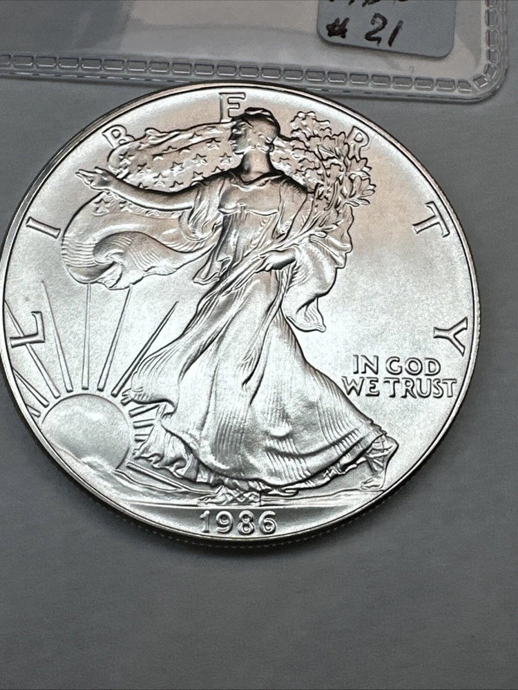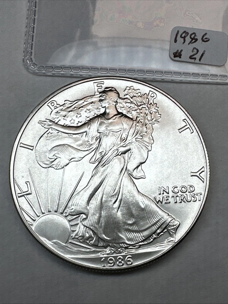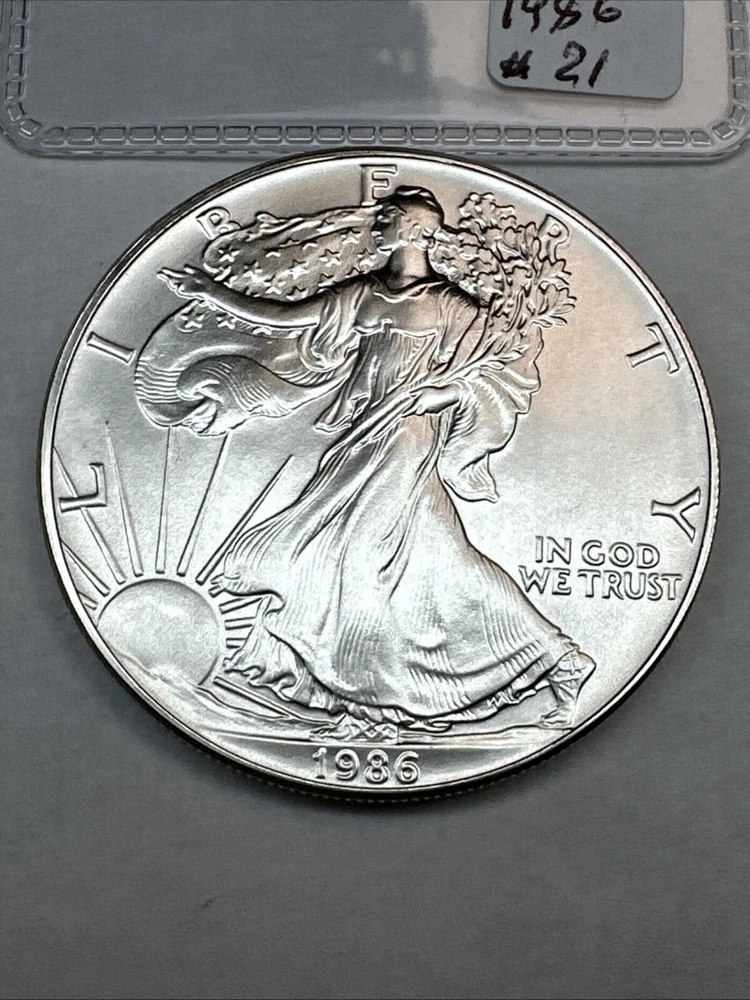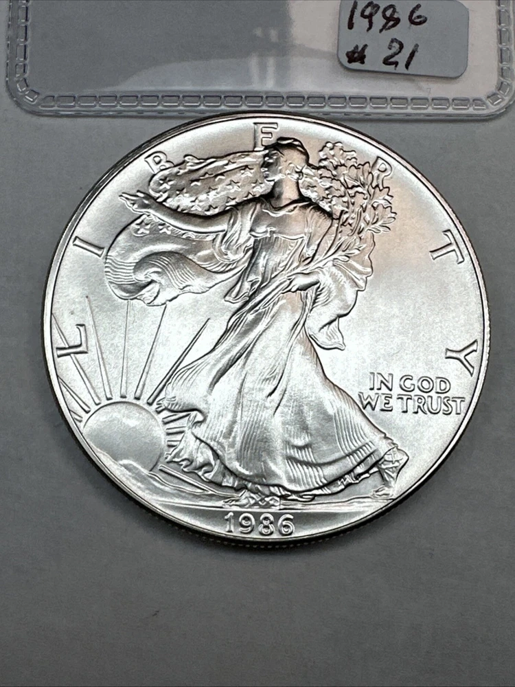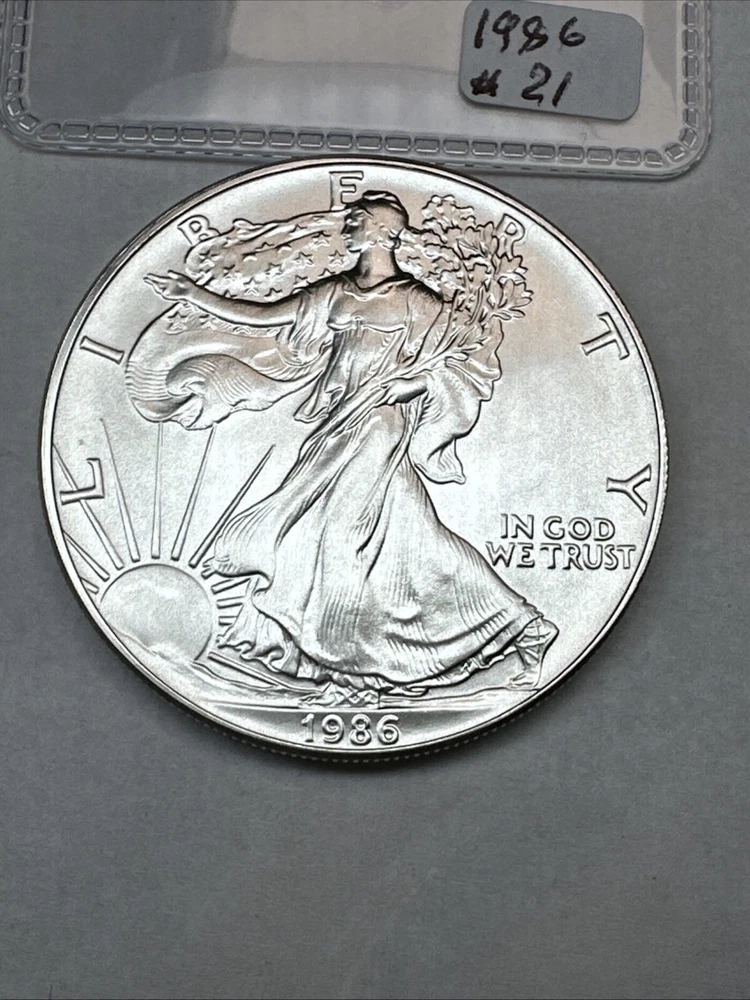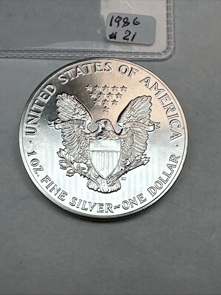 This product is a 1986 Uncirculated Silver American Eagle coin, minted by the U.S. Mint. It contains 1 oz of 0.999 fine silver. The coin features a business strike type and is ungraded and uncertified. It is a valuable piece for collectors and investors alike.