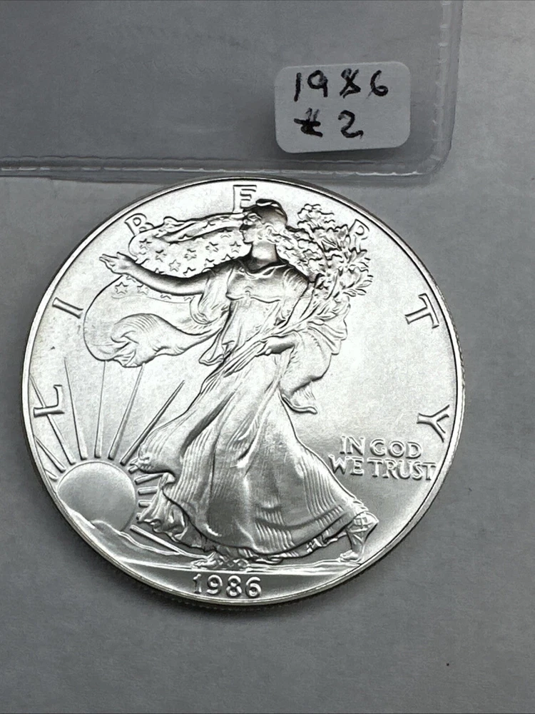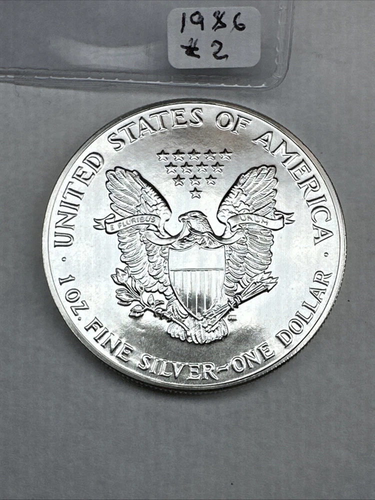 The product is a 1986 Uncirculated Silver American Eagle coin minted by the U.S. Mint. It contains 1 oz of 0.999 fine silver, making it a valuable bullion investment. This coin features the iconic American Eagle design and is a highly sought-after collectible item for coin enthusiasts and investors alike.
