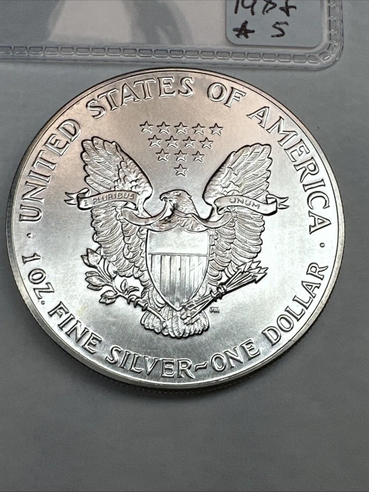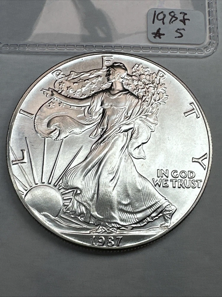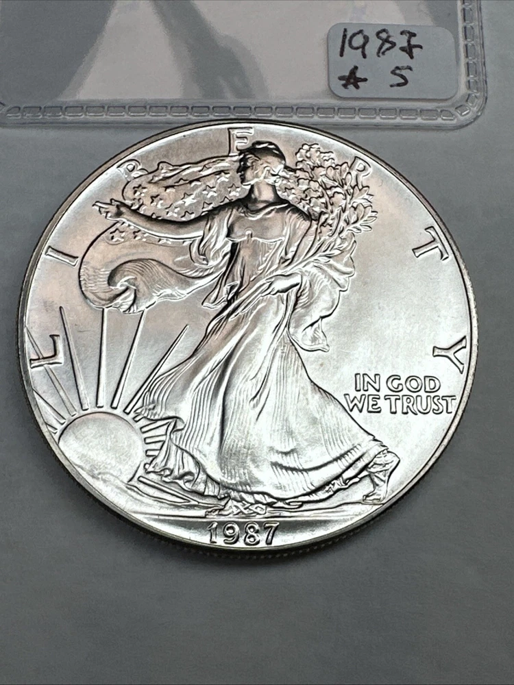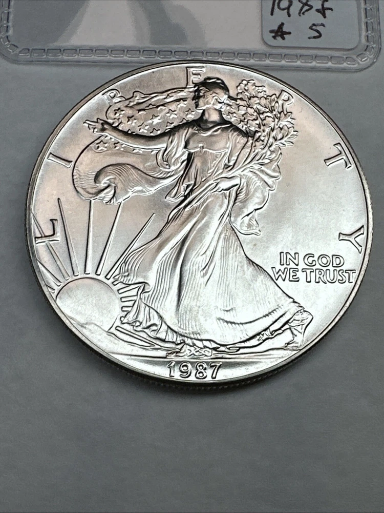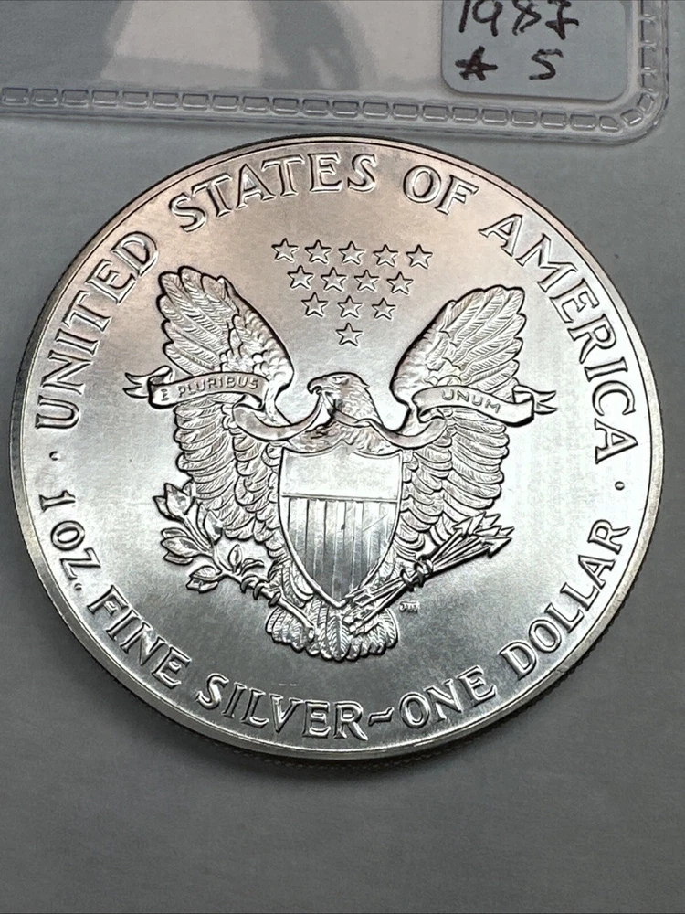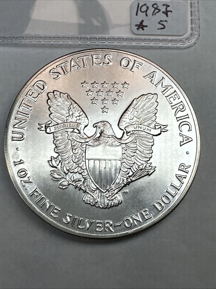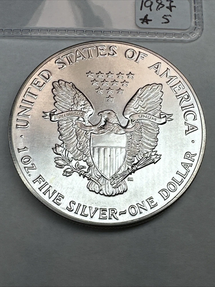 Total Precious Metal Content: 1oz Fineness: 0.999 Strike Type: Business Brand: Silver Eagle Certification: Uncertified Precious Metal Content per Unit: 1 oz Coin: American Eagle Brand/Mint: U.S. Mint Composition: Silver Grade: Ungraded Year: 1987 Country/Region of Manufacture: United States