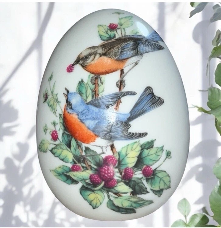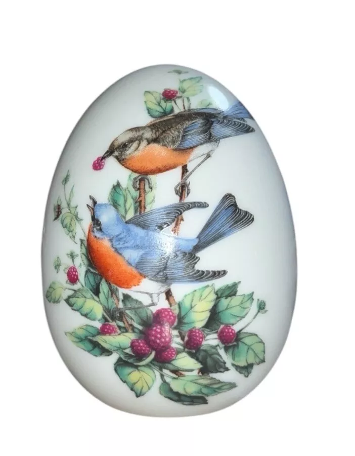 The 1987 Avon Four Seasons Porcelain Egg features a Summer theme called "Summer's Song Is Warm And Bright." It is made of ceramic & porcelain in a Multi-Color design. This original piece is from the post-1940 era and is a part of Avon's collectible decorative items. Avon Robins & Raspberries design Approx. 3”x 2” Porcelain material Perfect condition- no chips cracks or crazing Makes a great gift!