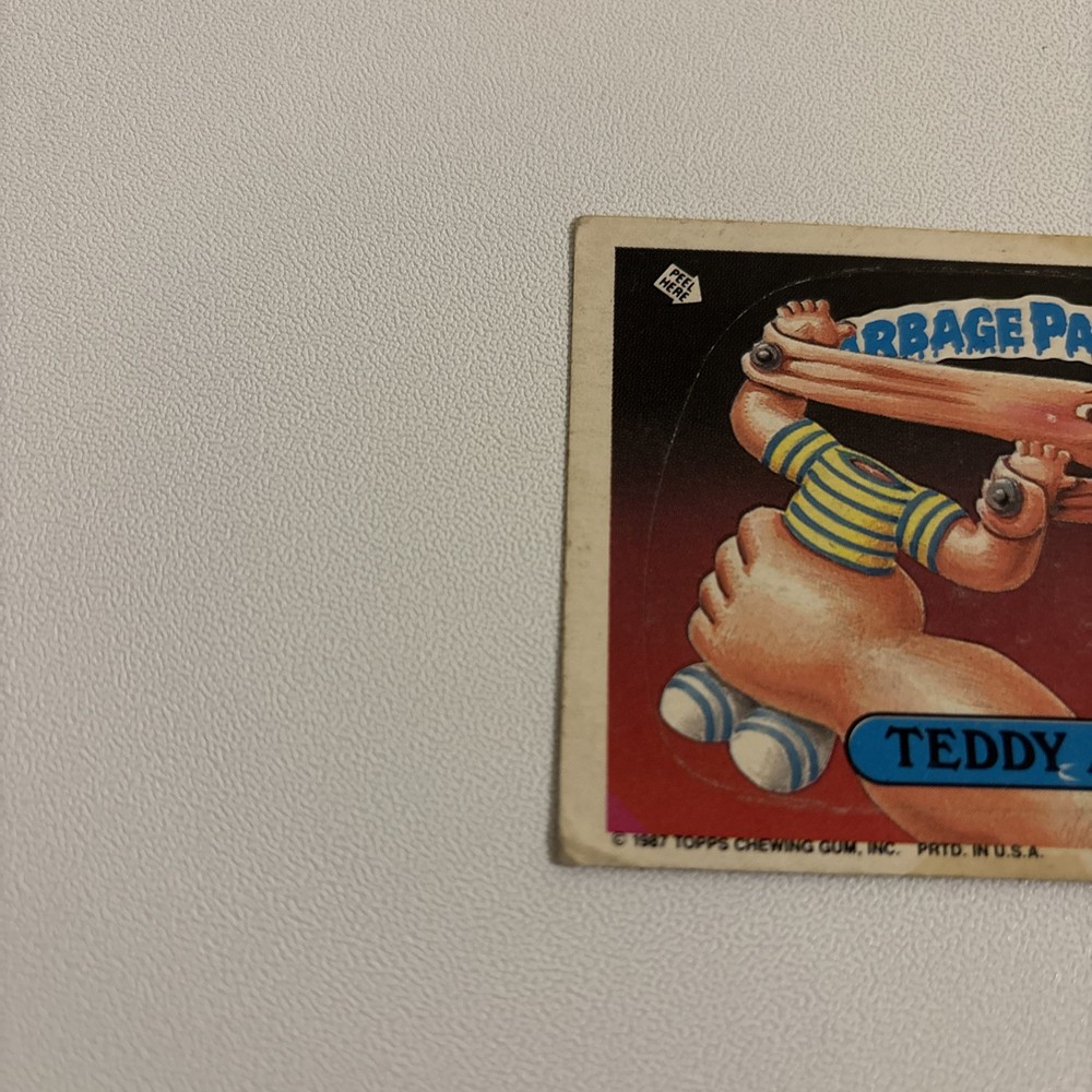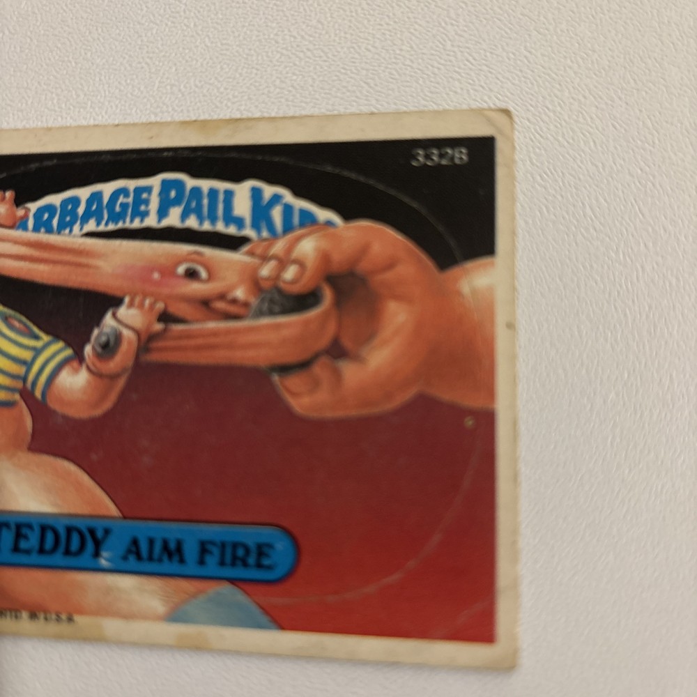 Good condition no rips B-1-2 This card is an aged card . IT is slightly dirty and do contain minor wear at the edges. Look at pictures before purchasing.This 1987 Garbage Pail Kids trading card features Teddy Aim Fire from the 8th series, numbered #332B. Produced by Topps, this non-sport trading card is a must-have for fans of the Garbage Pail Kids franchise. It is not graded, but is in excellent condition and is a great addition to any collection.book 1 page 2