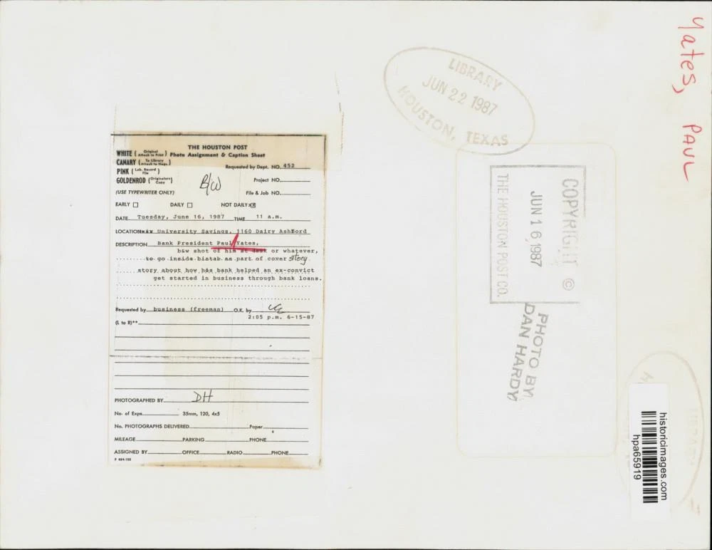 ebay template Note: Please study the images carefully to determine the condition of this vintage photograph, as it may not be in perfect condition. It may contain wrinkles, cracks, and possibly even tears due to its age and how it was handled before it got to us. A scanner may interpret colors and contrast differently than human eyes will, so it is possible that the actual photograph may be slightly darker or lighter in person. This vintage photograph is offered for sale as a collectible item and conveys no transfer of copyright. 1987 Press Photo Paul Yates, University Savings Bank President at his desk. This is an original press photo. Paul Yates, University Savings bank president shown at his desk, his bank helped ex-convict start a business with bank loan.Photo measures 7 x 9inches. Photo is dated 06-16-1987. PHOTO FRONT PHOTO BACK Historic Images Part Number: hpa65919 FAQs Q: Can I just download a digital version instead? A: No, we sell only vintage originals and do not make or distribute any copies, including digital ones. Q: Do you combine shipping and invoices? A: Multiple photos won on the same seller ID combine automatically through the eBay checkout process. If you encounter problems with this, send us a message via eBay messaging and we will send you an invoice. Due to eBay limitations, we cannot combine items won on our different seller IDs for a single shipping charge. Q: How quickly do you ship the items once paid? A: We ship within one business day after your payment clears. If you do not receive an "order shipped" email from us by the close of the second business day from submitting payment, please e-mail us via eBay messaging. Q: How do you make sure my photograph arrives safely? A: We package each order between two cross-corrugated pieces of cardboard to ensure that the package is as difficult to bend as possible. We then wrap each order in a plastic sheet to help protect against moisture. We want you to rest assured that we take every precaution to ensure that the photograph you receive will be in the same condition in your care as it was in ours. Q: Will the "Historic Images" watermark be on my photo when I receive it? A: No. This is a digital watermark we use to protect our images. It is not printed on the photo. Q: What are your office hours? A: eBay for us is a business, and a very fun one to be in! We are open M-F 9 to 5 (CST). Therefore, we do not return e-mails and phone calls over the weekend. We observe the following holidays: New Years Day, Memorial Day, Fourth of July, Labor Day, Thanksgiving and the day after Thanksgiving, Christmas Eve and Christmas Day. Q: Where did all these vintage photos come from? A: These original vintage photographs are from various news service and newspaper photo archives from locations around the country including: Boston, Detroit, Tampa, Chicago, Denver, Seattle, New Orleans, Milwaukee, Portland, Spokane, and more. We do not copy or reproduce any photographs -- every item is a unique vintage piece that was housed in a news archive. Q: Can I use this photograph in my book/blog/website? A: The short answer is no. There is no transfer of copyright for republication or reproduction with these photographs when you purchase them, and only photographs taken before 1923 are currently automatically in the public domain. Permission from the copyright holder, which usually can be identified from the back of each photo, must be sought to republish or reproduce the image for any purpose. Q: Do you relist items (in case I miss an auction ending)? A: Auction items that receive no bids are relisted in our store (historicimages-store on eBay) as a fixed-price item and at a higher price than the starting auction price. Q: Do you leave feedback? A: Yes, we always leave feedback for buyers. Our software monitors when our buyers leave us feedback, then notifies us that we can leave feedback for the buyer. Rest assured, if you leave feedback, we will do the same! Check out our family of eBay IDs: historicimages01 Sports Photos historicimages02 Entertainment Photos historicimages03 Americana Photos historicimages04 International & War Photos historicimages05 Transportation Photos historicimages06 Photos of All Subjects historicimages07 Entertainment Photos historicimages08 Newsworthy Photos historicimages09 Entertainment Photos historicimages10 Sports Photos historicimages-store Our largest fixed-price selection historicimages-gallery Hand-picked photos Saturday night auctions About Us Historic Images was formed in September 2009, with a handful of scanners working out of a basement to digitize newspaper photo archives. We have since moved out of the basement, and we can now archive thousands of photos per day. Our company has worked with magazines and newspapers from Detroit, Boston, Denver, Seattle, Tampa, Chicago, and New Orleans, just to name a few. We are constantly adding to our inventory, and have assembled an archive of millions of photos to date. As our company evolved, we began our eBay business, which brings thousands of fresh auctions per week to the world's largest online auction marketplace. Our custom software systems and team of great employees allow us to efficiently scan and sell large photo archives online. At the very core of our company's DNA is a strong commitment to customer satisfaction and strict integrity for our product. Our promise to you is that we will do everything in our power to provide you a great buying experience. Copyright 2009 - Present, Historic Images, Inc. Sell Smarter with Kyozou. Inventory and Ecommerce Management