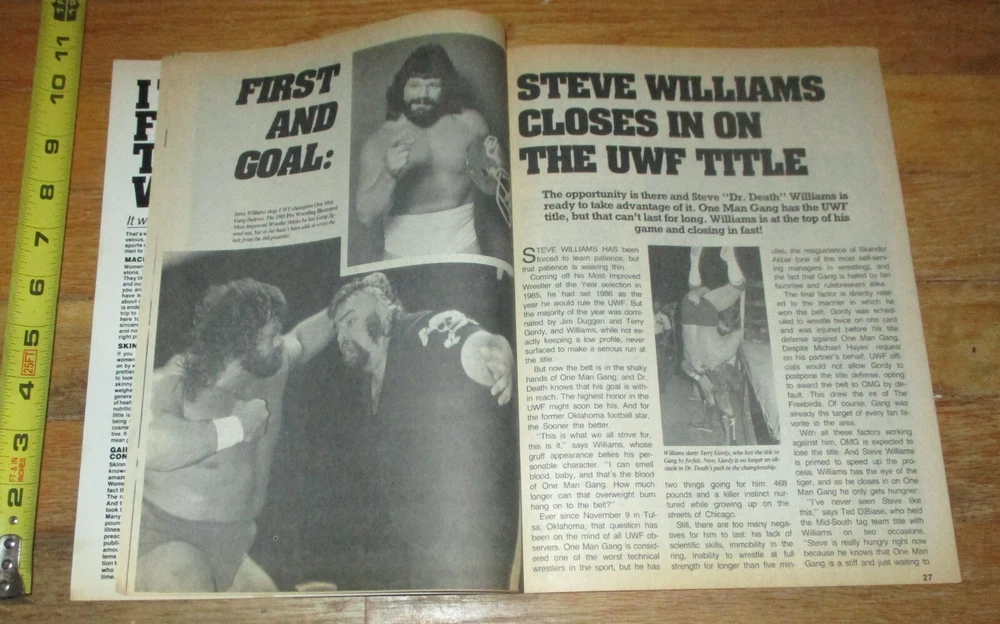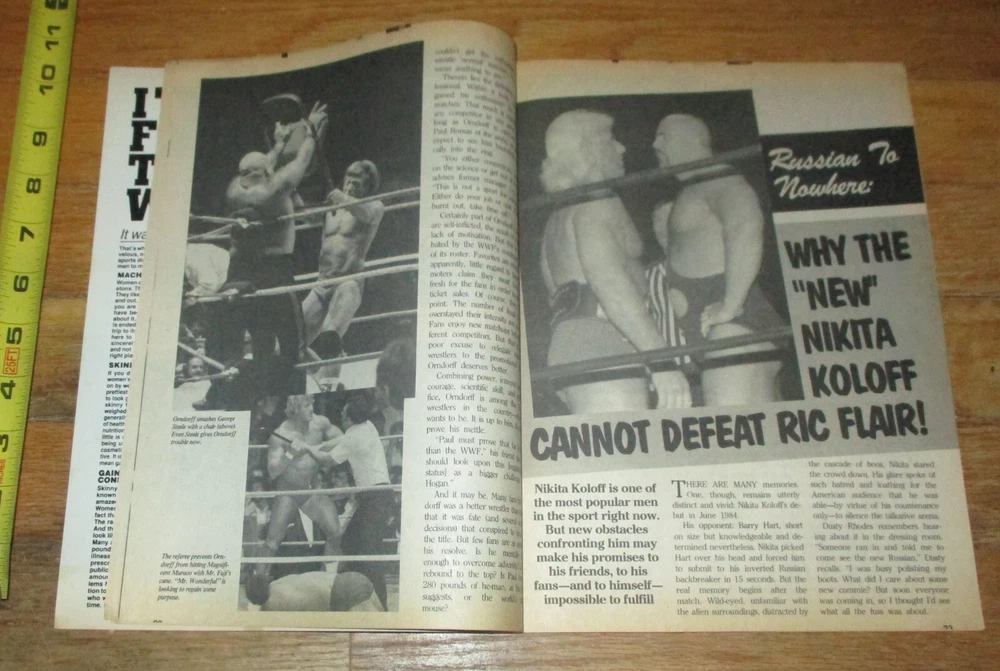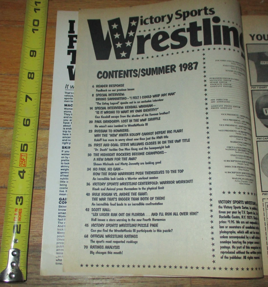 This item is a Summer 1987 Sports Review Wrestling Magazine. It features former NWA WWF WWE WCW AWA UWF Wrestling Stars and WWE Hall of Fame members Hawk and Animal the Road Warriors The Legion of Doom, Nikita Koloff, Nature Boy Ric Flair, Hulk Hogan, Andre the Giant and the Rockers HBK Heartbreak Kid Shawn Michaels who is now NXT head and Marty Jannetty on the Cover. Articles include an interview with Bruno Sammartino, and Interview with Kendall Windham, Mr Wonderful Paul Orndorff, Nikita Koloff vs Ric Flair, Dr Death Steve Williams, The Rockers becoming AWA Tag champions, The Road Warriors workout including a full color centerfold poster, Hulk vs Andre, Scott Hall in Florida, Wrestling ratings and more. Magazine is in good condition overall but does have a stain in "sports" on the top part and minor wear to the edges and corners as can be seen in the photos as it is 37 years old. It will be shipped in a magazine bag and backer board. Shipping outside of the United States will be extra. Please check out my other wrestling auctions and contact me with any questions or wrestling related item requests. Serious bidders only as negative comments will be placed if bids are not completed. Good Luck