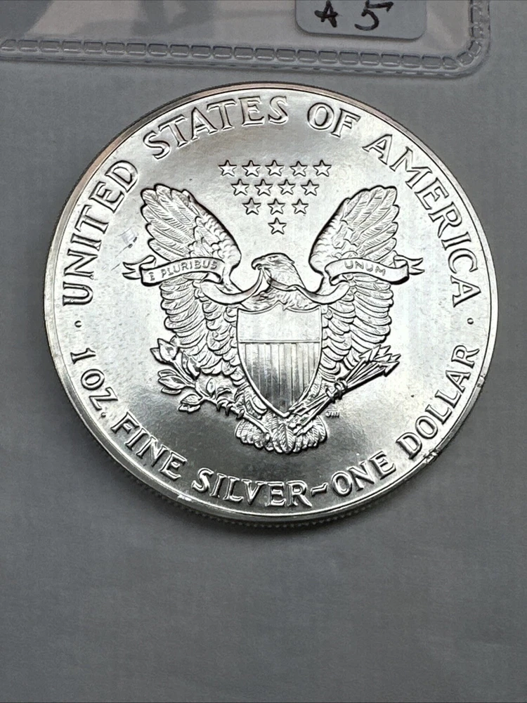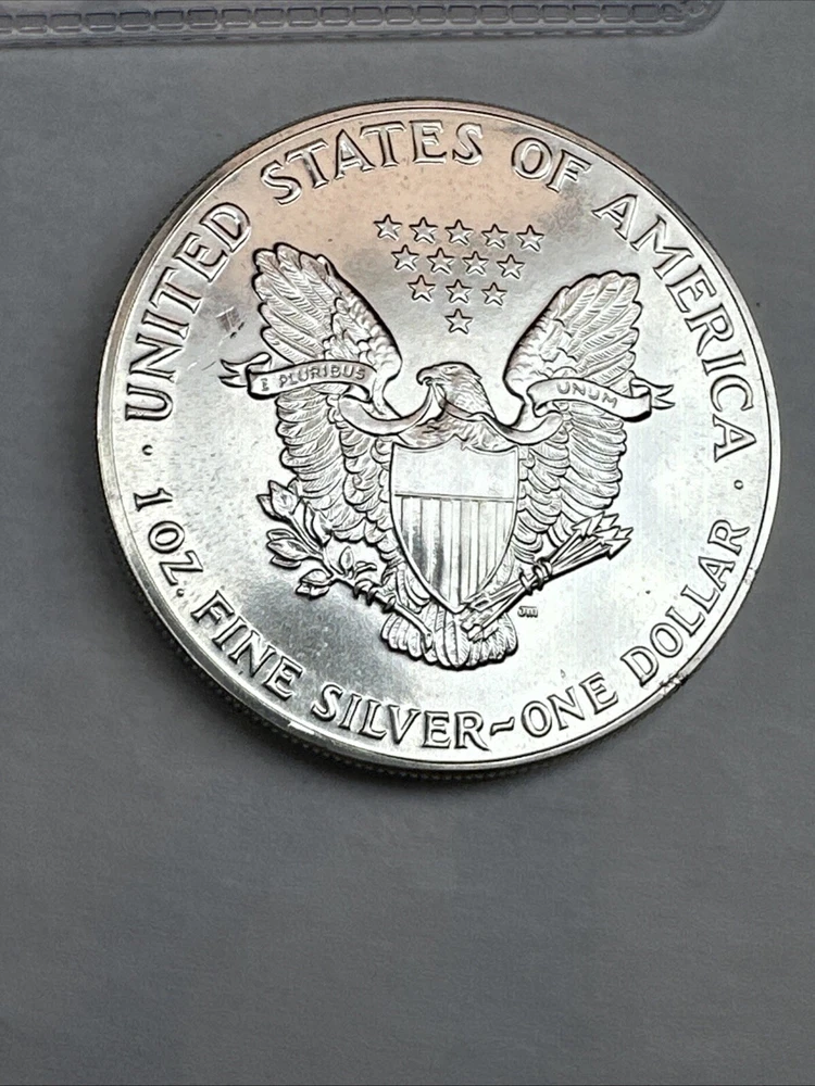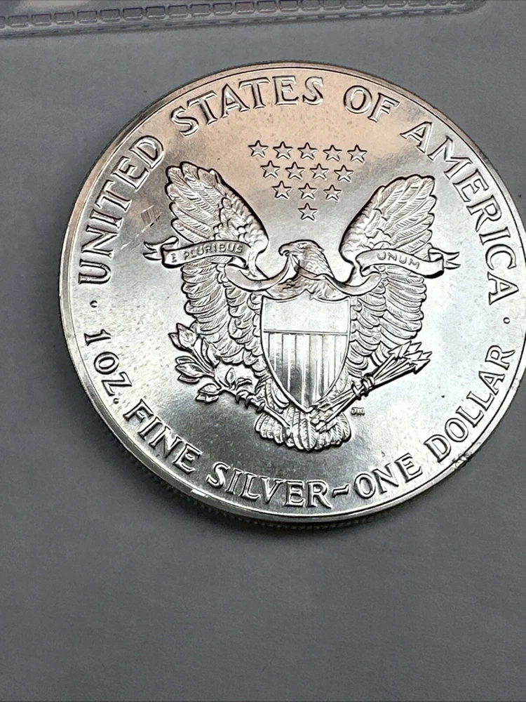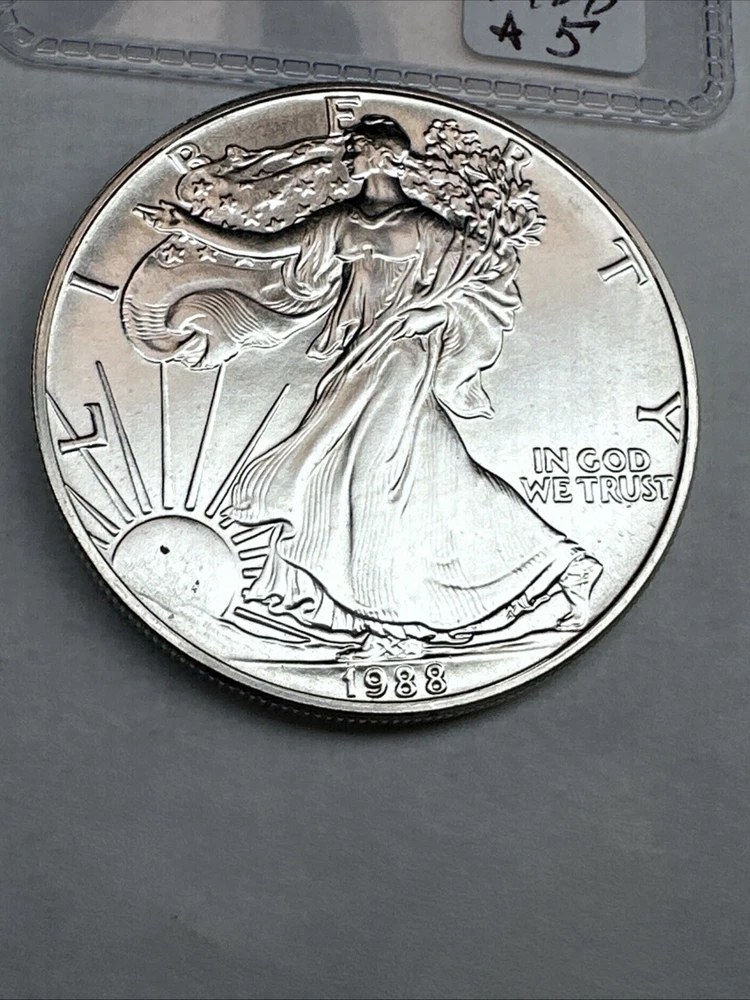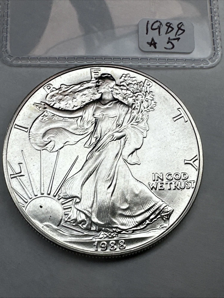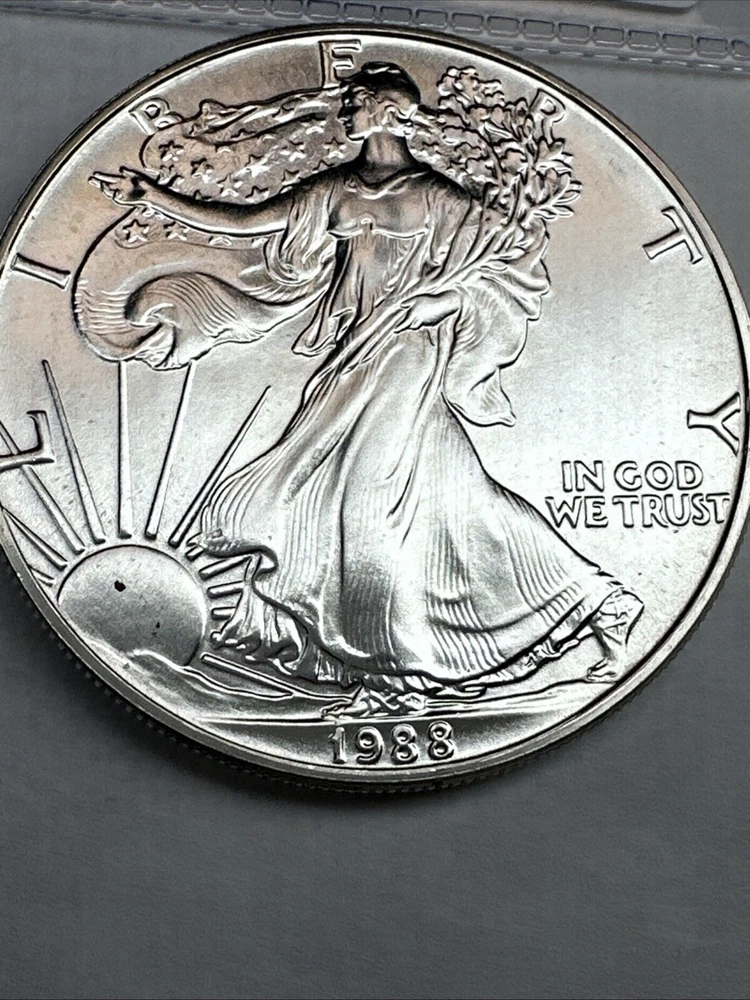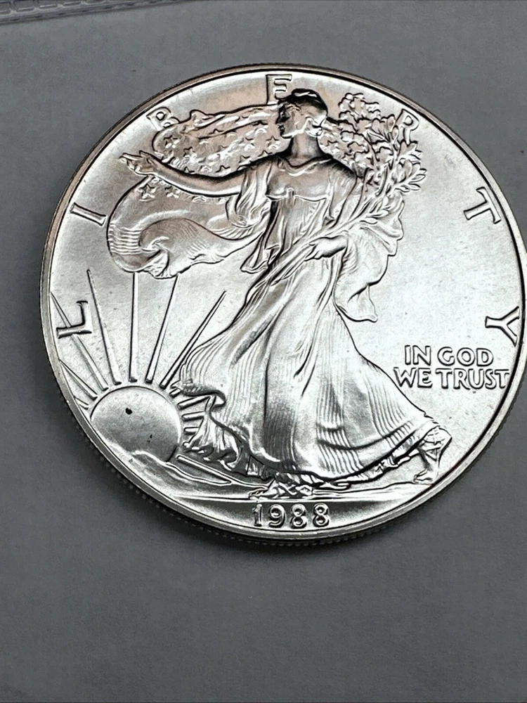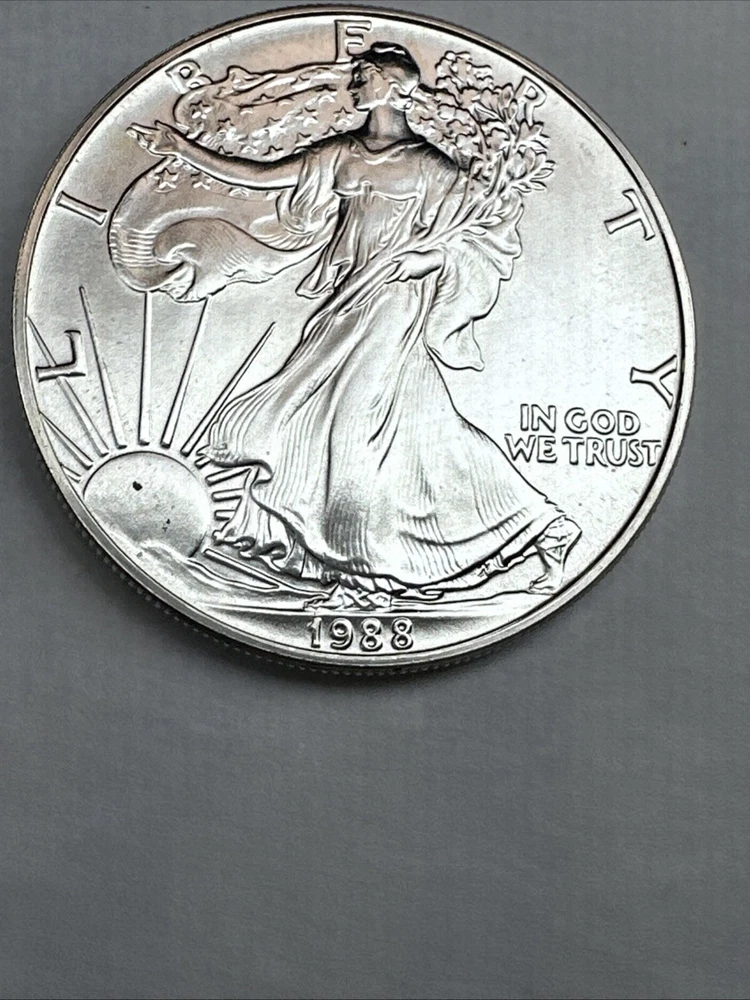 The product is a 1988 American Silver Eagle coin, minted by the U.S. Mint. It contains 1 oz of .999 fine silver, marked with a business strike type. The coin features the iconic Silver Eagle design and is certified as Brilliant Uncirculated.
