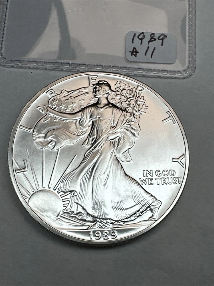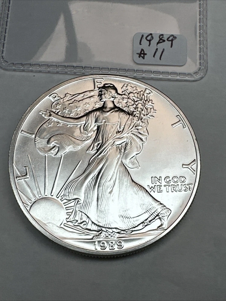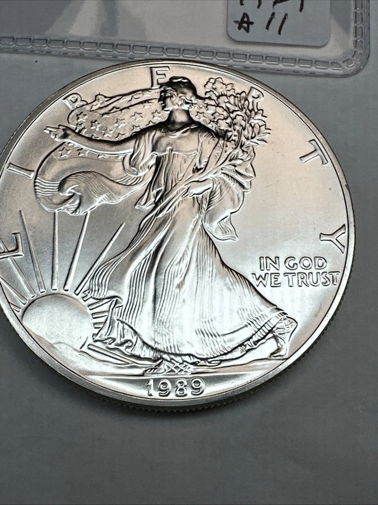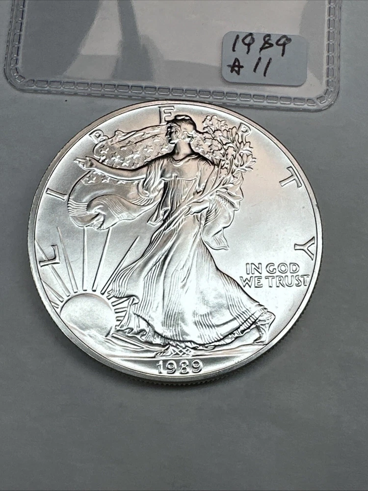 Precious Metal Content per Unit: 1 oz Total Precious Metal Content: 1oz Strike Type: Business Composition: Silver Grade: Ungraded Coin: American Eagle Country/Region of Manufacture: United States Brand/Mint: U.S. Mint Fineness: 0.999 Certification: Uncertified Brand: Silver Eagle Year: 1989