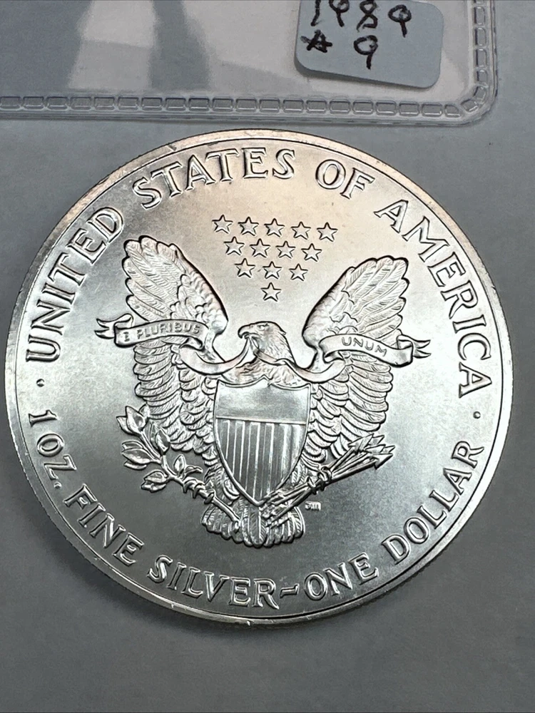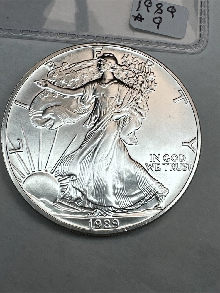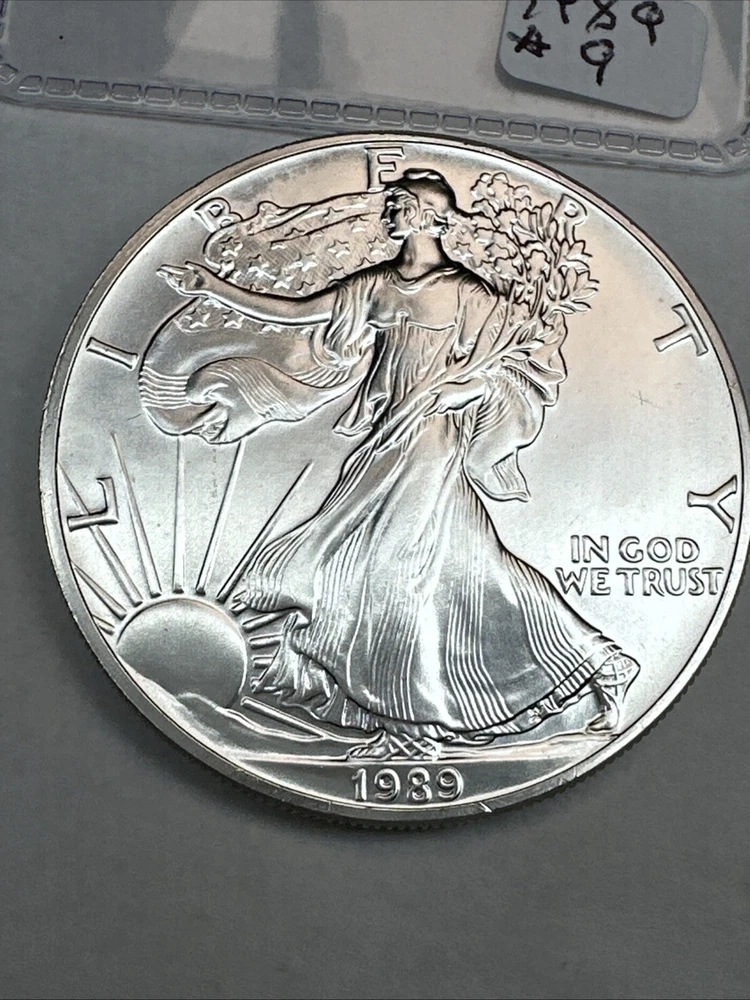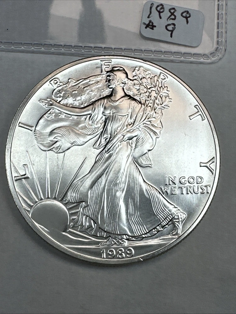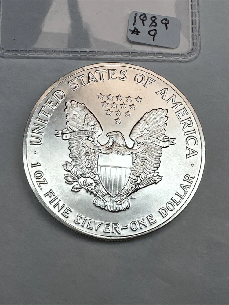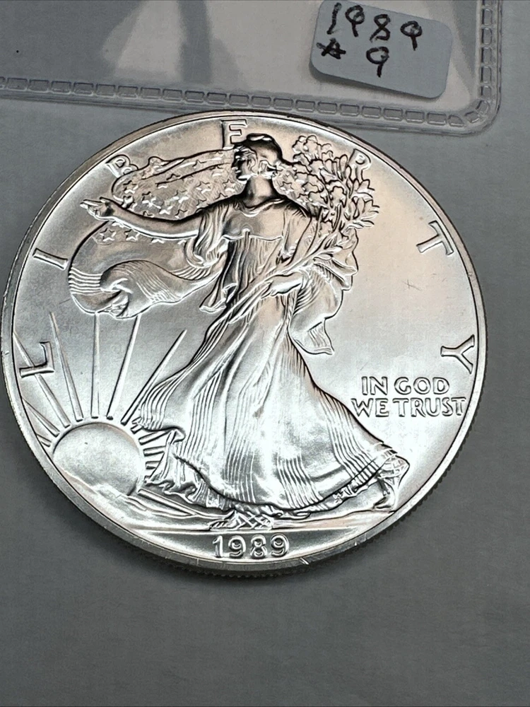 Grade: Ungraded Precious Metal Content per Unit: 1 oz Certification: Uncertified Year: 1989 Coin: American Eagle Composition: Silver Strike Type: Business Brand/Mint: U.S. Mint Total Precious Metal Content: 1oz Brand: Silver Eagle Country/Region of Manufacture: United States Fineness: 0.999