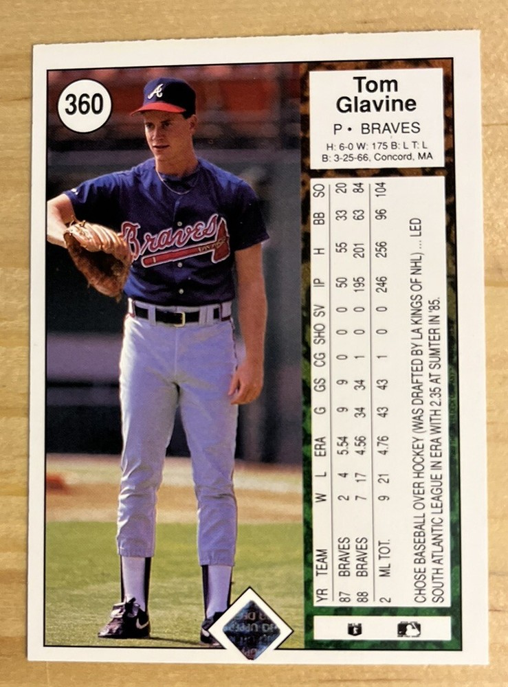 This is a 1989 Upper Deck baseball trading card featuring Tom Glavine, a Major League Baseball Hall of Famer who played for the Atlanta Braves. The card is made of high-quality card stock with a thickness of 20 Pt. and is an original from the 1989 Upper Deck set. It is a part of the base set and has the card number 360. The card is in excellent shape, and it is a great addition to any baseball card collection. It is perfect for fans of the Atlanta Braves, Tom Glavine, or anyone who loves vintage baseball cards. This card is a must-have for any collector and is a fantastic piece of sports memorabilia.